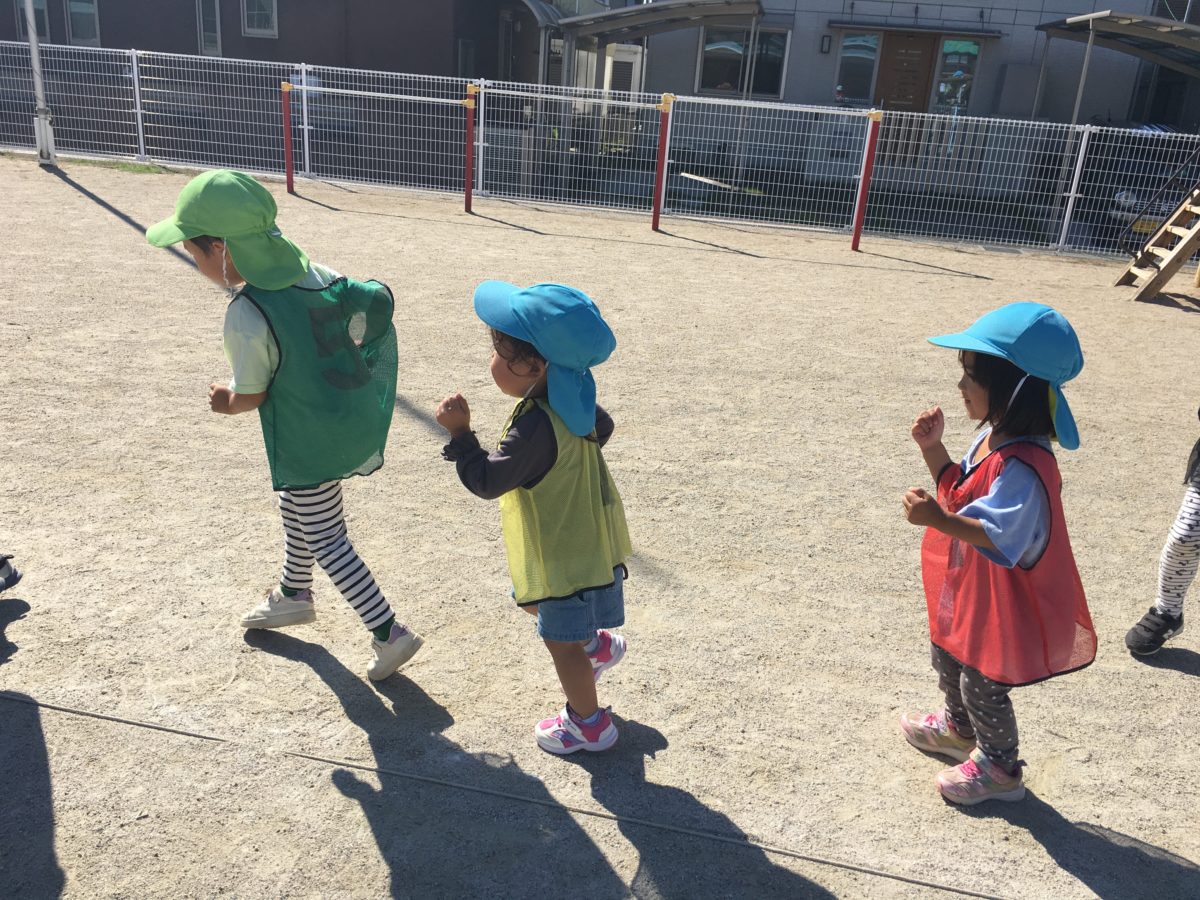 今日は普段使っているバトンから少し変えて、変わり種バトンを準備してみました。すると子どもたちからは「えー!それがきょうばとんになるの?」「ぼくはフラフープがいい!」など3種類のバトンがある中でどれがいいかを選ぶ姿や「いや、きっとこれがいちばんもってはしりやすいとおもうな!」と走りやすさを重視するめろん組さんの姿などいろんな姿がありました。そして3チームでじゃんけんをし勝ったチームから好きなバトンを選びました。リレーが始まるとどんなバトンでもみんな真剣勝負!で一生懸命走り切る姿がありました。それぞれがいろんな持ち方をしながら走りやすさを考える様子なども見られました。またみんなでダンス♪久しぶりに入場行進などもすると「なんかうんどうかいみたい。」とみんな嬉しそうにお友だちと入場行進!!そしてりんご組さんも曲が流れてくると大きい子と同じようにダンスをはじめていました。かっこよく手足を動かして大きい子にも負けないくらい元気に踊る姿はとってもかわいらしくてかっこよかったです。