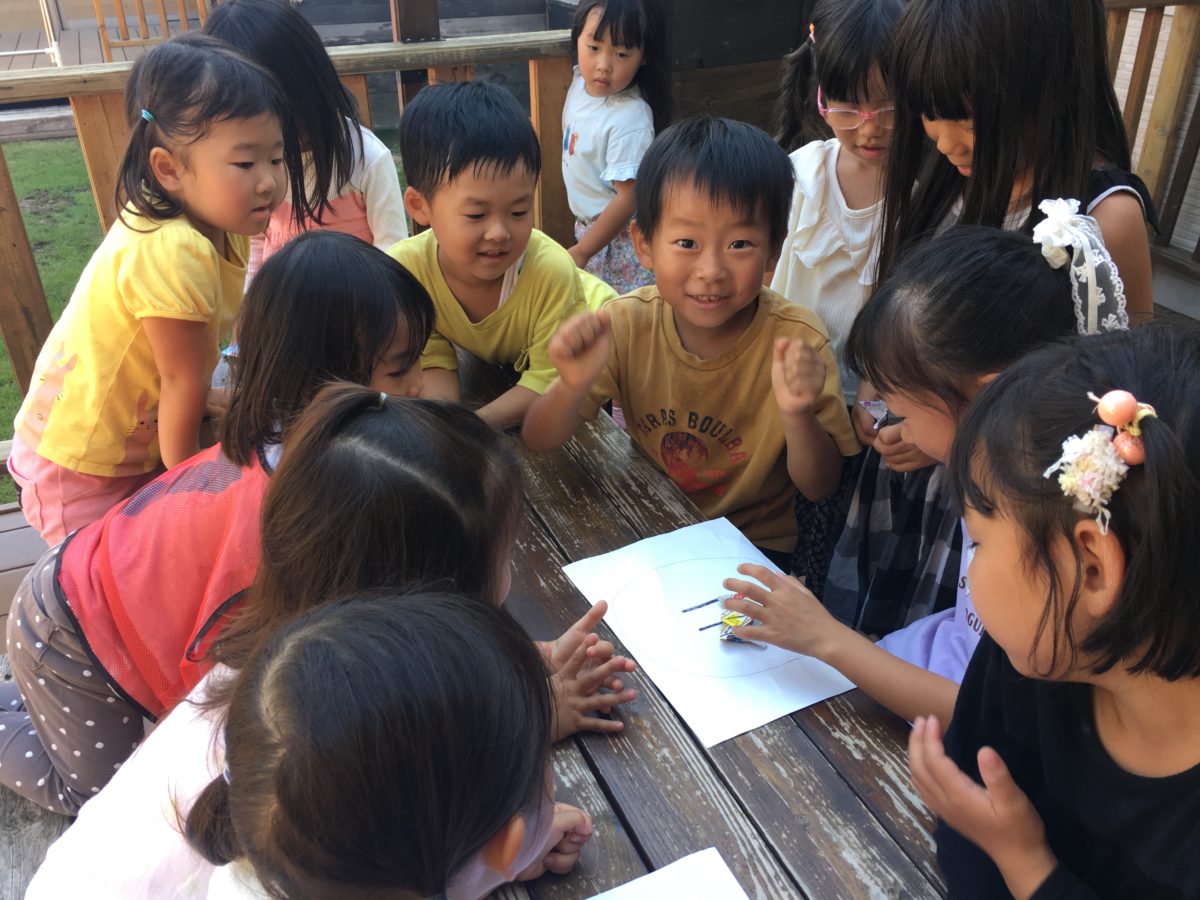 お部屋では、紙相撲大会。何人かのお友だちでトーナメントを組み対決をすると「やったーかてた!」「けっしょうせんにいけるー」と決勝戦まで勝ち上がったことを喜んでいる姿がありました。その姿を見て「なにやってるの?」と興味を示す子どもたち。そして決勝戦の時にはたくさんのお友だちに応援してもらったりと盛り上がる様子がありました。