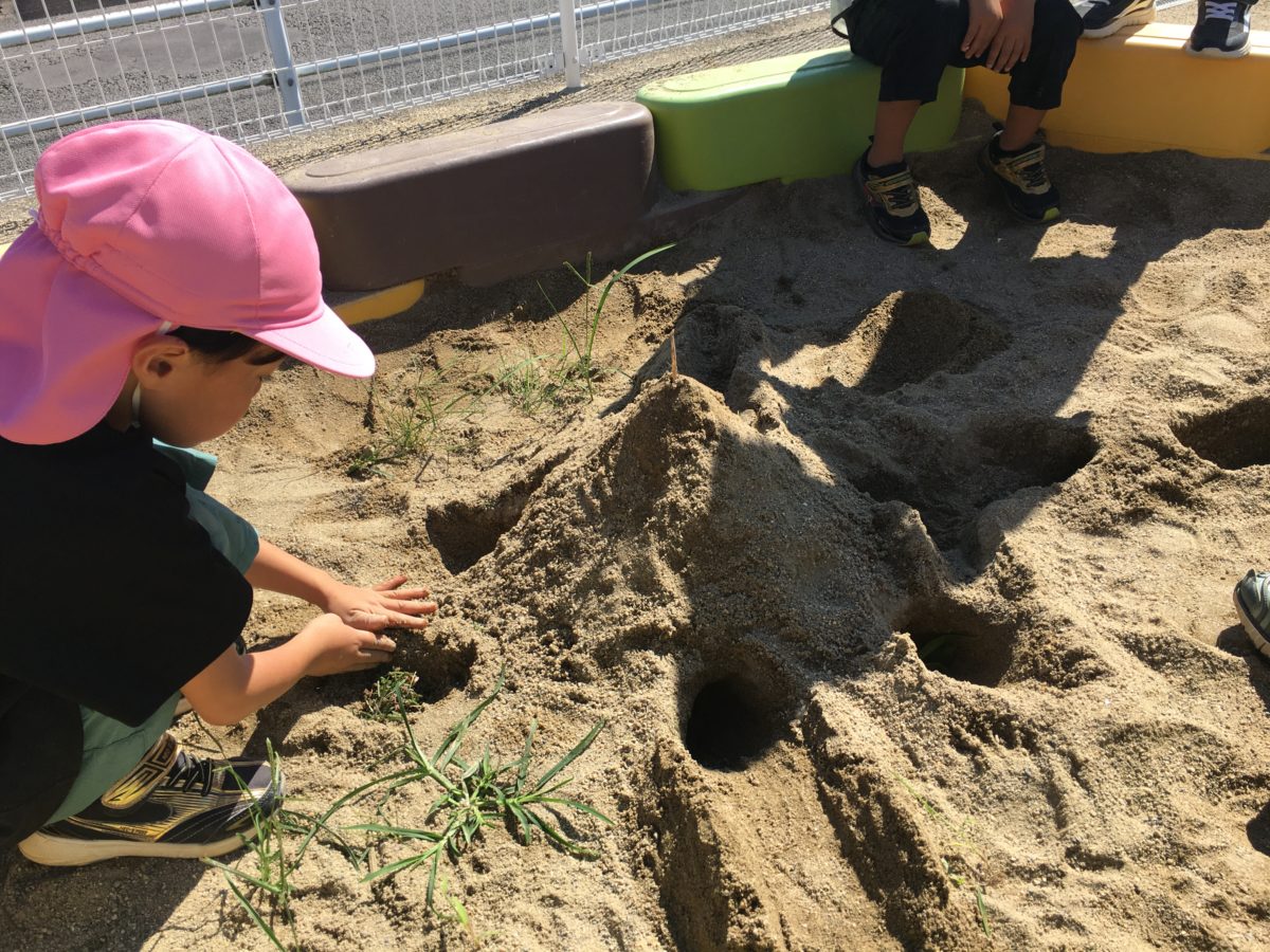 バッタのおしろつくっとんの~!「ばったやではっぱもじゅんびしたろうか?」とみんなでアイデアを出し合いながら立派なお城が作られていました。