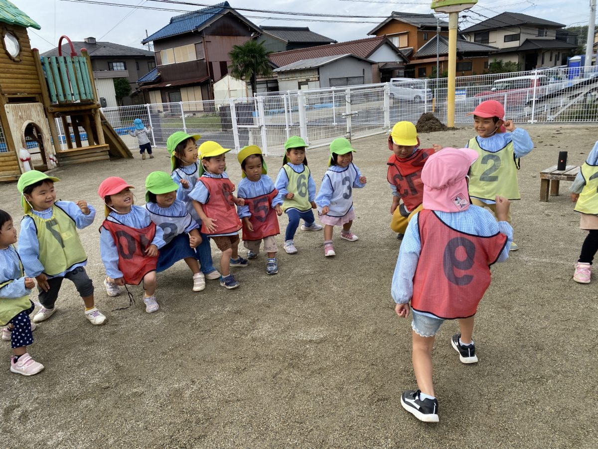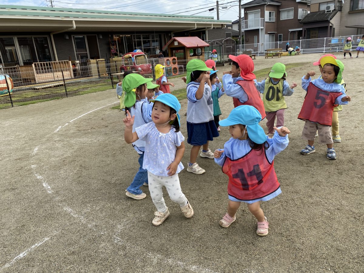 今度の日曜日の河原田地区文化祭の作品展に出展するめろん組さんの作品を見ていると「これがすき!」「これいいな!」「これすごい!!」とお友だちが集まってきていました。額に飾られているのを見て「〇〇ちゃんもつくってみたいな」と作ってみたい!という意欲が芽生えたり、自分の作品を見てもらったりお友だちの作品を見ながら会話がはずんでいました。「ダンスおにごっこしよう!」と最近子どもたちが楽しくてたまらない曲の間は踊って!曲が止まると逃げる!という鬼ごっこをお友だちと誘い合って楽しむ姿がありました。鬼にタッチされてしまうと悔しい!と感じながらもまた曲が始まると踊って切り替えて・・・と何度も繰り返し一生懸命に逃げる姿がありました。さくらんぼ組さんがみんな鬼!という回では、年上のお友だち相手でもどうにかつかまえようとさくらんぼ組さんが最後まで全力で走る素敵な様子が見られました。音楽をよくききながら、踊る!逃げる!を判断して体を動かしたり、音楽が止まった瞬間の「にげる!?」とドキドキした瞬間にはお友だちと一緒に「キャー!!」と言いながら生き生きと走り出していました。