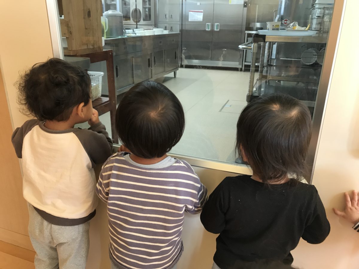 「おなかがすいたね〜。」と言うので、給食室を見にいきました。「ご飯なに?」「うどんやでー。」とお話しながら覗いてました。