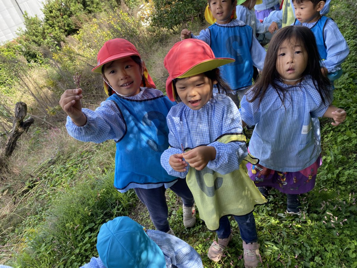 今日は雨も上がり、みんなでお散歩へ出かけました。実がなっている柿の木にたくさん出会うと先日より実がなっている柿が多いことに気付く声も聞こえていました。りんご組さんのお友だちは柿の実が高い所にあったこともあり、みかんと間違えて「みかん!」「みかん!」と喜ぶ声があると「これは、かき!」と教えていました。しばらくしてみかんの木や河原田みかんの看板を見つけると「これが、みかん!」と教えたり「か・わ・ら・だってかいてある!」など漢字を読んでいました。みかん山で生き物や草花を見つけて自然に触れたり、農芸高校のお姉さんや地域の方との交流を楽しむ姿がありました。また木の葉が黄色に変化していることに気付くと「これが、あきのはっぱ!」と集めてお友だちと見せ合って楽しんでいました。公民館の前を通る時には「ここ、しっとる!」「トラがおるところ」「ほんもののトラ?」「ちがう、にんげんがはいっとるトラ!」と話し「獅子舞」の話題があがっていました。「とら?」「にんげんがはいってる?」と不思議そうにしていたお友だちも園に戻ってから河原田地区のししまいの動画を見ると「これ、しっとる!」「ししまい!」と興味を示している姿がありました。