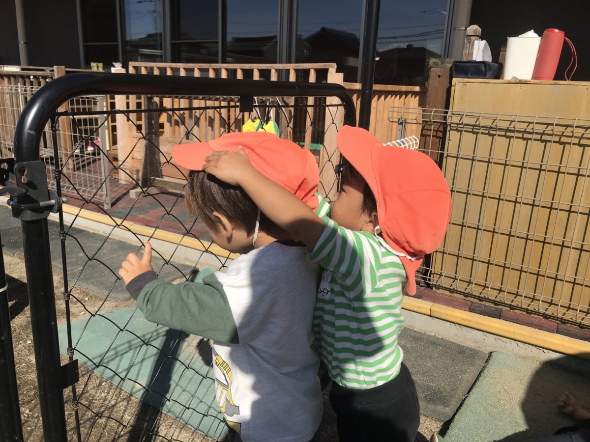 園庭を手を繋いでぐるっとお散歩。「おにいちゃんおるかな?」と周りを見渡しながら園庭散歩を楽しみました。