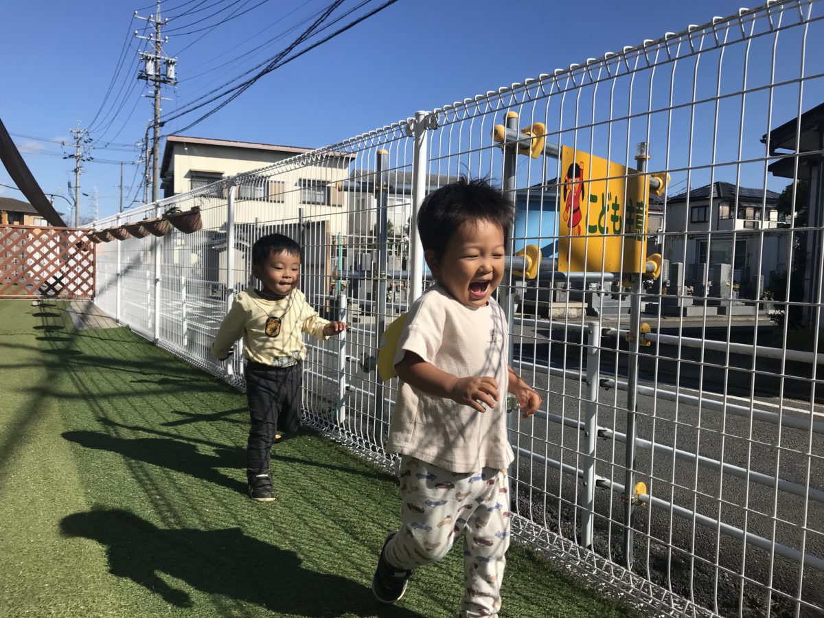 今日は靴を履いて園庭に出ました。園庭では車の遊具に乗ってグルグルッとハンドルを回して遊んでいたり、自分たちで『よ~いどん!』と言って、園庭をかけっこする姿があったりしました。思いっきり走りたいのかな?と思い、人工芝の引いてある所に場所を移動して思いっきり走れるようにすると、とても楽しそうに走り出す姿が。「よ~いどん!」の掛け声も大きい声で言う姿もあり、その掛け声に合わせて楽しそうに走り出していました。遊具のある園庭では思いっきり走ることが出来なかった分、人工芝の方では各々が力いっぱいに走り出し、走るのに疲れてくると、靴を履くように用意してあった椅子に腰かけて休憩をしていたりもして、その姿もまたとても可愛らしかったです。