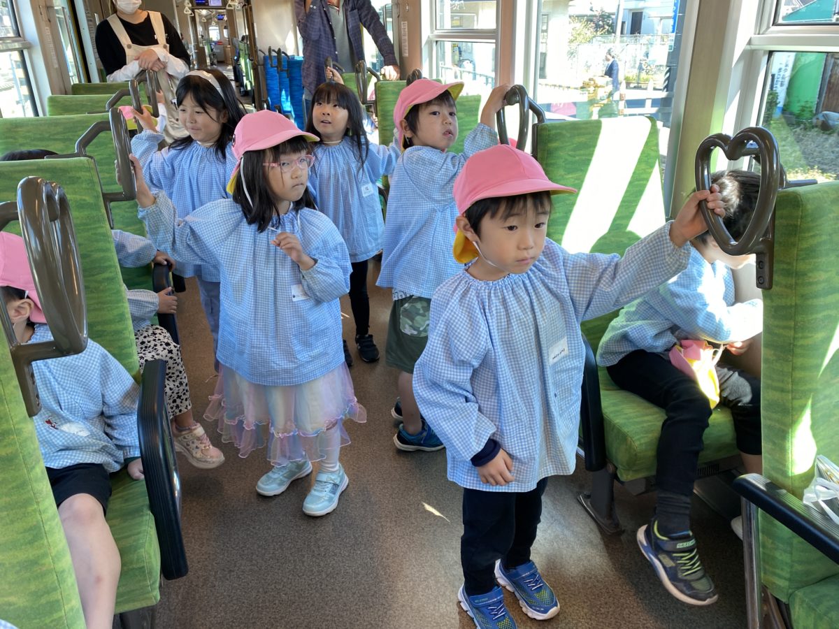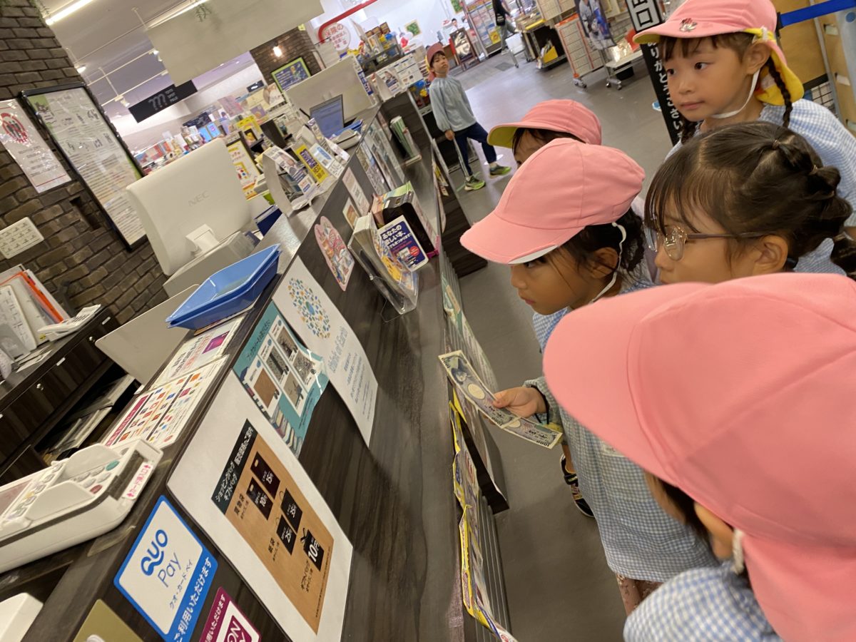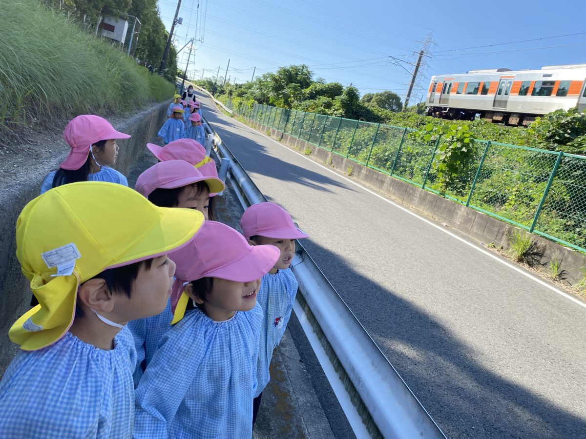 めろん組さんはどこ行くの!?とドキドキわくわくしながらお散歩に出かけました。線路沿いを歩いていると電車の音が聞こえてくるたびに「あっでんしゃ!!」と喜びながら、電車が好きなお友だちに「〇〇くん、あのでんしゃはなんていうでんしゃ!?」と尋ねて会話がはずんでいました。「ほいくえんにかえったら、はやくでんしゃのえがかきたいなー。」と話していたお友だちは園に戻るとすぐに今日見た電車や踏切の絵を描いて、みんなで乗ったね!!との会話も出ると電車の中にみんなの顔を描いていく姿がありました。イオンに到着すると少しドキドキしながらお友だちと数人ずつで相談して好きな絵本を選びました。「ほいくえんにないのにしよう!」「これ、まえよんだのおもしろかったよ!」「あたらしいの、あるよ!」様々なアイデアを出して相談したりじゃんけんで決めて、買う絵本を選んでいました。お金を払うときには買えるかな?とドキドキしながらお金を出していました。帰り道は電車に乗ろうと駅に到着すると「でんしゃにのるの!?」「きっぷかう?」「どっちからでんしゃがくるかな?」とたくさんドキドキわくわくしていました。帰り道に三冊の絵本を持って歩くのは大変でしたがお友だちと協力して持ち帰っていました。園に戻ると「電車に乗ったよ!」「泊まりのイオンに行ったよ!!」「バッタ、みつけたよ!」たくさんの楽しいお土産話を小さい組さんにしてくれていました。さくらんぼ組さんやばなな組さんは、バトンをアレンジしてのリレーを楽しみました。いつもより大きいバトンは大変でしたが一生懸命に運んでいました。またりんご組さんは大きい子の真似っこをして何度もジャンプ!!してハードルに挑戦して体を動かしていました。