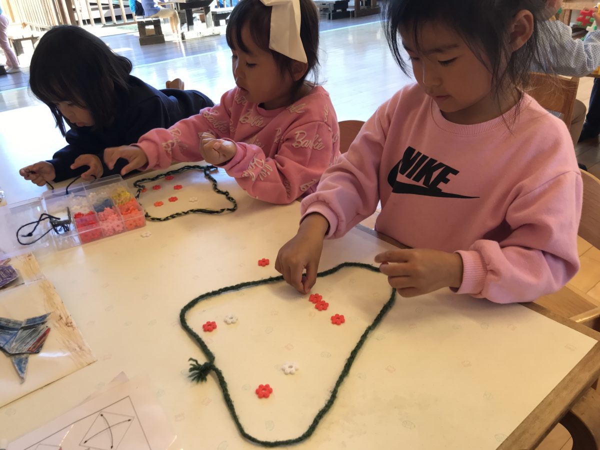 昨日土手へお散歩に行きツルでリース作りをしたのを覚えていたのか「リースつくりたい!」「きのうつくっとるこ、おった!」と興味津々な様子の子ども達。細い紙を使い「どんなかたちにしよう?」と各々考えながらリースのような五角形にしたり四角にしたりと自分の好きな形になるようハサミで長さを調整しながら器用につなげていました。形が完成すると「はーとかきたい!」「けいとつける~!」と飾り付けが始まりました。色鉛筆を使いデコレーションする子もいれば、布を好きな形に切り、貼っている子など様々でみんなとても素敵なリースを作っていました。途中ハサミの持ち方が分からず困っているさくらんぼ組のお友だちがいると「こうやってもつんやで~?」と優しく教えてあげるばなな組さんの様子がありました。また、最近おはじきを使い紐通しに挑戦している子ども達。「ネックレスつくる!」「あおとあかでつくる!」と自分の好きな色合いになるよう、紐を通す順番など考えている子や「これでまるつくる~!」とリースで使った毛糸を丸にしてその中におはじきを並べお顔を完成させる子もいました。