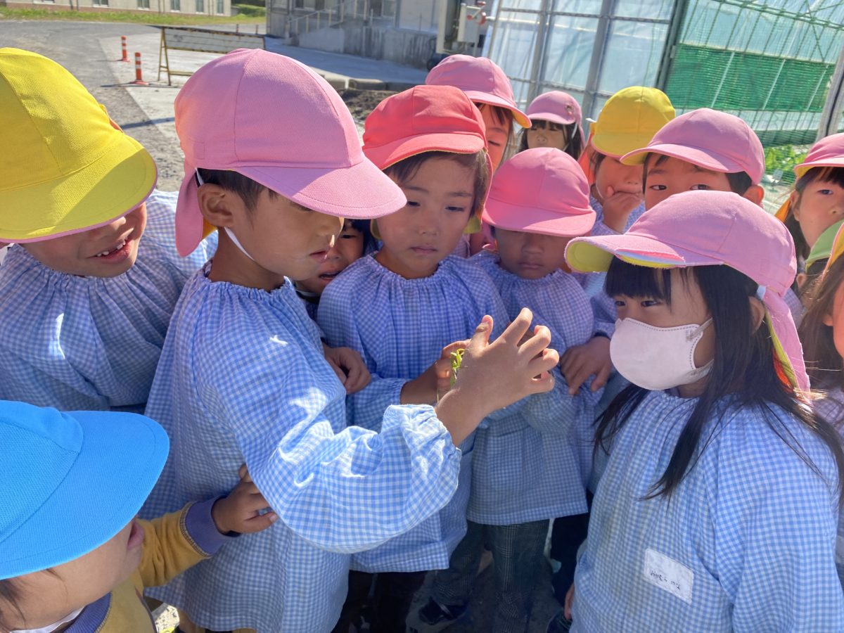 かまきりを発見し「かまれやんようにきをつけて・・・」みんなで観察中!