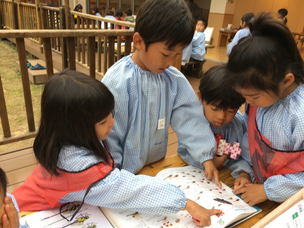 昨日夕方見つけたナツアカネ。それを覚えていたのか図鑑を見ながら「きのうみつけたのどれだっけ?」と探そうとする子どもたち。すると「これだよ~!ナツアカネ」と載っているのを見つけると「へぇ、なつじゃないのになんでとんでたんだろうね!」と子どもたちはトンボの名前に〔ナツ〕が付いていることからこんな時期に飛んでいたことが不思議だったようです。