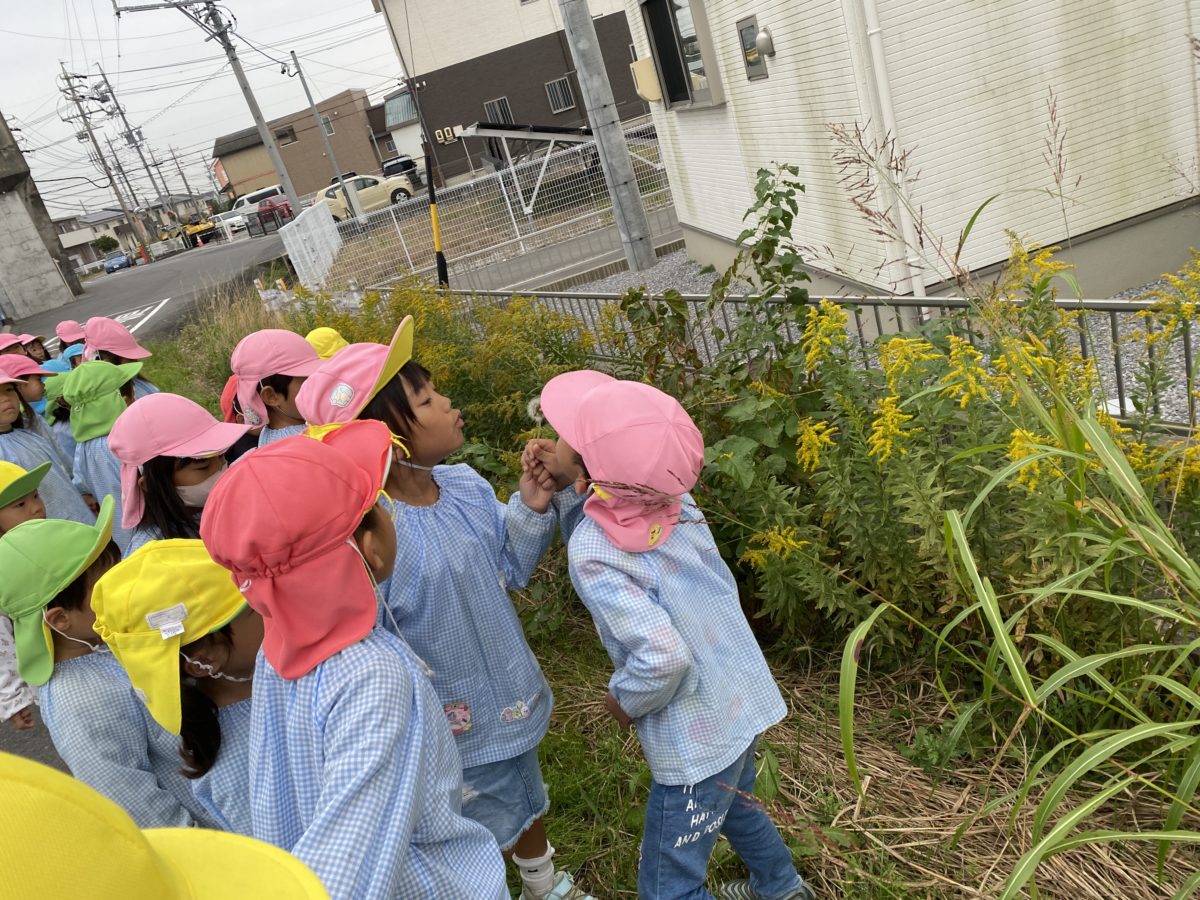 たんぽぽみーつけた!!と綿毛のたんぽぽを見つけてフーっと息をふきかけています♪
