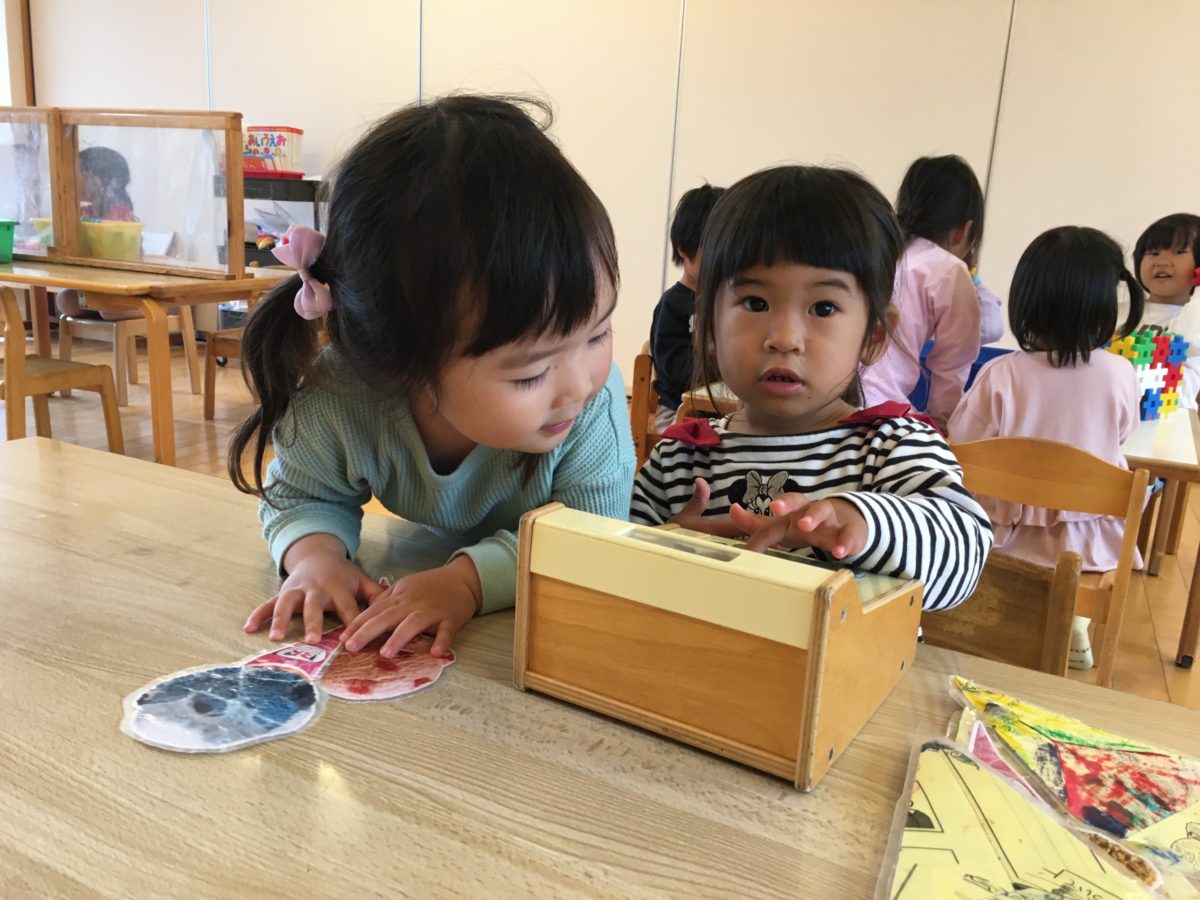 昨日に引き続き、折り紙でリースづくりを楽しんでいた中で、ハサミを使って、布を切ろうとしていた子どもたち。「てをきらないようにそっとそっと…」と自分で意識していた子どもたち。すると周りで見ていたお友だちにも「てをきらないようにきをつけてね!」と声をかけて気にかけるような様子もありました。めろん組さんは、お散歩へ出発!!保育園の近くでタンポポを発見し「わたげだー!」と綿毛の状態のたんぽぽを手に取りふーっと息を吹きかけて楽しんでいました。「あーふわふわとんでった♪」と嬉しそうに飛んでいく綿毛を見つめていました。りんご組さんはレジのおもちゃを使って、ごっこ遊び。「きょうはあいすくりーむやさんです♪」とアイスクリームの写真や大きい子が折り紙で作ったアイスクリームを商品にしながら「アイスいかがですか~?」とお友だちと会話のやり取りも楽しんでいました。