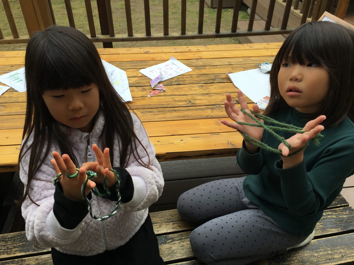 あやとりに夢中なようで2人あやとりをする様子やあやとりマジックや技を披露しあいながら楽しんでいます。