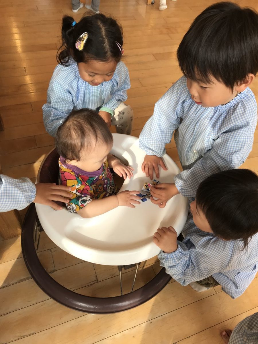 一方、すいか組のお友だちは、園内をお散歩していました。大きい子のいるお部屋も通り、お兄さんお姉さんたちの遊んでいるおもちゃに興味を持ち、机の近くまで行き触ろうとしている姿を見てお兄さんお姉さんが「このおもちゃ使う?」とおもちゃを持ってきてくれて、触ってみたりお兄さんお姉さんに「どーぞ」と渡していました。