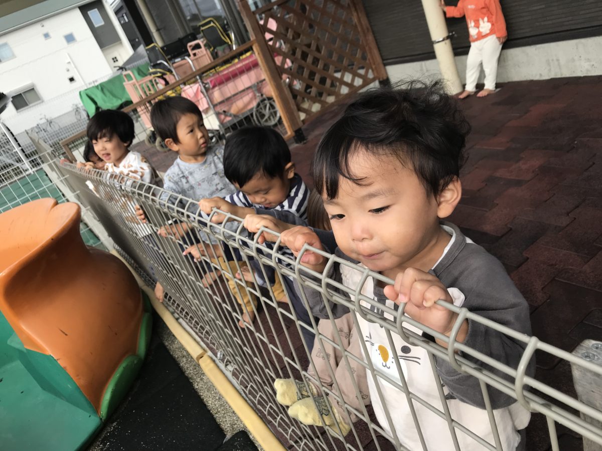 園庭でお兄さんお姉さんが鬼ごっこをしているのを見つけ、テラスの柵に近づき「がんばれ~」と声を上げて応援をしていた子どもたち、お兄さんたちの盛り上がりの声を聞いて拍手をして一緒に盛り上がっていました。