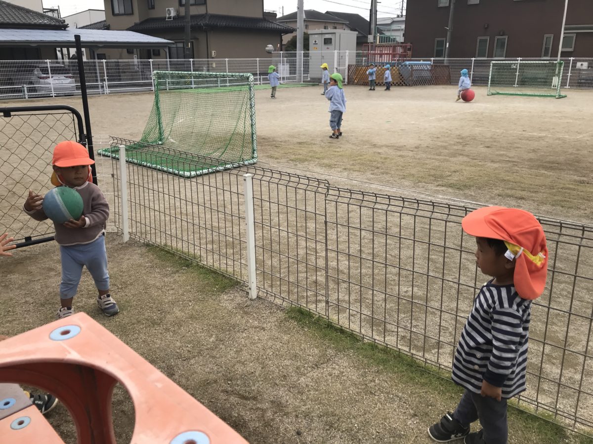 その後、園庭に出るとボールを発見!お友達に向かってボールを投げるとキャッチボールが始まりました。お友達がボールを投げると「キャー!」と声を上げていました。ボールを投げるときに「いくよー」と言いながら上手にお友達めがけてボールを投げ、ほかのお友だちも「こっちだよー」と声を出し、一緒にボールを転がしたり投げたりして遊んでいました。お砂場にいったお友だちは、「ショベルカー!」と言いながら自分の腕をショベルカーに見立てて、「ウィーン」と言いながら砂を掘っては集めて山を作っていました。一緒に砂場に行っていたほかのお友だちは、砂を握り「おだんごだよー」と言いながら作っていました。丸になるように掌で転がそうとしてみたり、形が固まるようにギュッギュッと握って工夫をしながらお団子を作り、お団子ができると砂場のふちに並べ「できたよー」と言っていました。