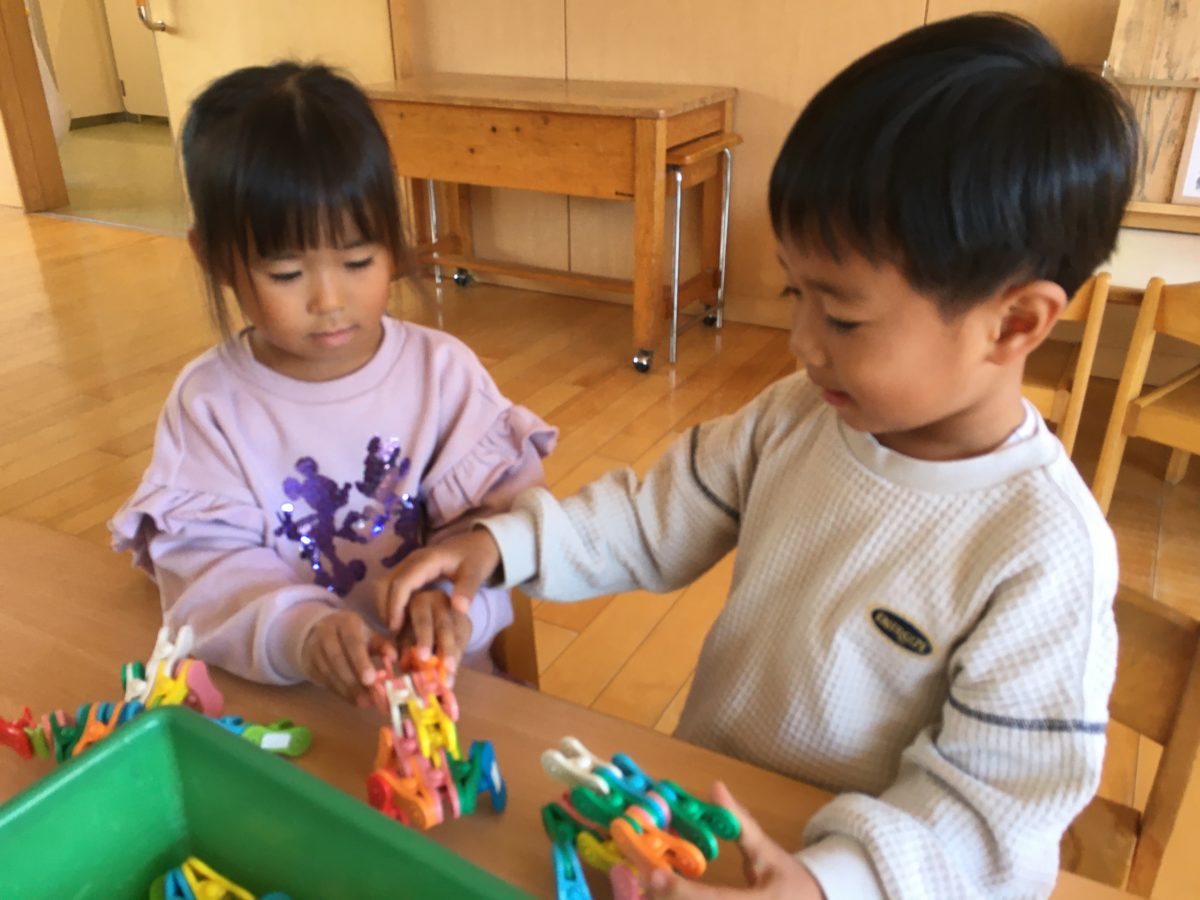 今日はさくらんぼ組VSばなな組のリレー対決をしました。「ばななぐみさんにかてるかな~。」「かってみたいな。」と話す姿がある中でばなな組さんも「さくらんぼぐみさんにまけられやんよな。」「がんばってはしろ!!」と意気込むような姿もありました。そして、その後には、かけっこチャンピオンをおこない、さくらんぼ組のチャンピオンとばなな組のチャンピオンで対決を行いました。すると…タッチの差でばなな組さんが勝ちましたが「さくらんぼさんもめっちゃはやかったー!」「ぼくやったらまけてしまうかもしれへん。」という声も聞こえてきました。体をたくさん動かした後には、砂場で泥団子づくりが始まりました。「ここのすな(すなば)にみずいれてどろつくって・・・そのあとにしろいすなかけるときれいになるよ!」と砂をかけて、擦ってを繰り返しきれいな泥団子を作ろうと挑戦していましたが力が少しでも強くなってしまうと「あー!こわれた。さっきのけっこうきれいなかたちやったんやけどな。くやしい。」ときれいに仕上がっていたものが崩れて残念に思っている姿があるかと思いきや、「よし、もう1こつくってみるかー!」と新しい泥団子づくりが始まりました。泥団子を作る中で、1つのもの集中して作る姿やきれいになっていく嬉しさを感じながら楽しむ姿も見られました。