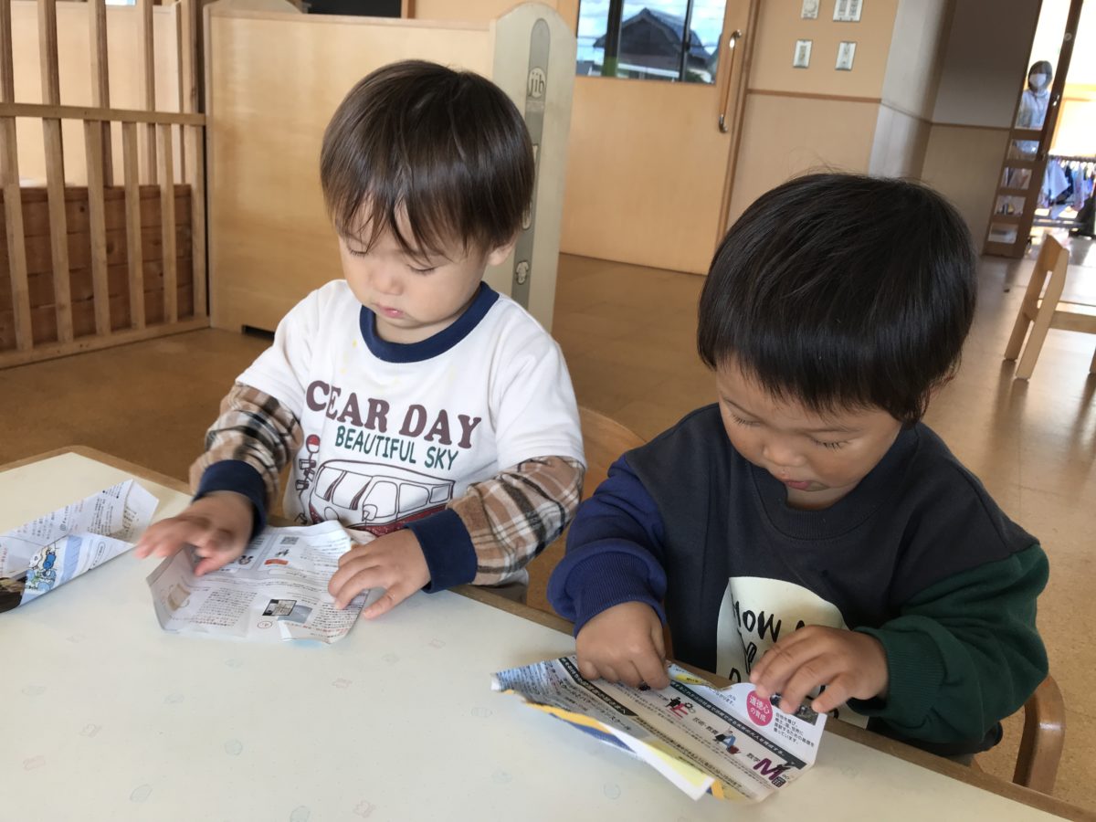 折り紙を見つけて真剣な表情でパタンパタンと折り始めました。端っこを三角に折ったり、何度も折りたたんで細長くしたり思い思いに折って楽しんでいました。完成すると自分の折り紙を大事に持ってテラスでお友だちと見せ合いっこをして盛り上がっていました。