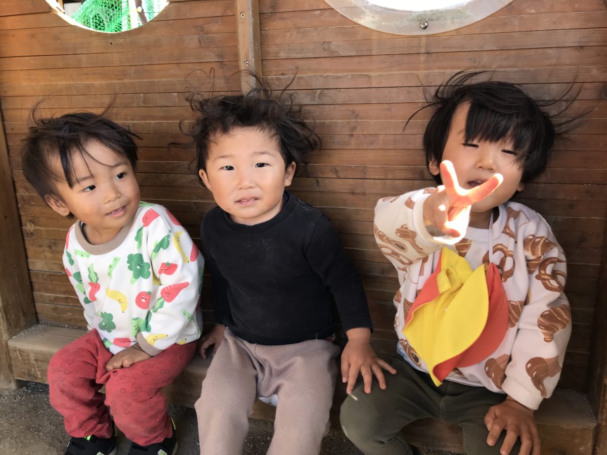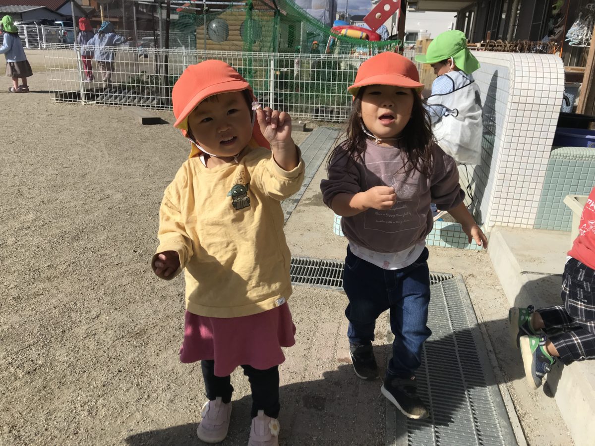 園庭では帽子を深くかぶってお友だちが見えてるかな?と何度も覗き込んで、目が合う度に嬉しそうに笑い合う姿がありました。また、手をつないで一緒に椅子や段差に腰かけて笑い合う微笑ましい姿などがたくさん見られました。そんな姿を撮ろうとカメラを用意すると「ハイチーズ!」とピースをして横に並ぶお友だちも。それを見たお友だちはピースの手を真似しようと『どうするのかな?』と自分の手とお友だちのピースの手を見比べながら一生懸命な姿が見られました。お友だちと一緒に会話を楽しんだり真似をしたり、面白いと思ったことをお友だちと何度も繰り返して笑い合う姿が増えており、お友だち同士の関係も深まってきているようです。