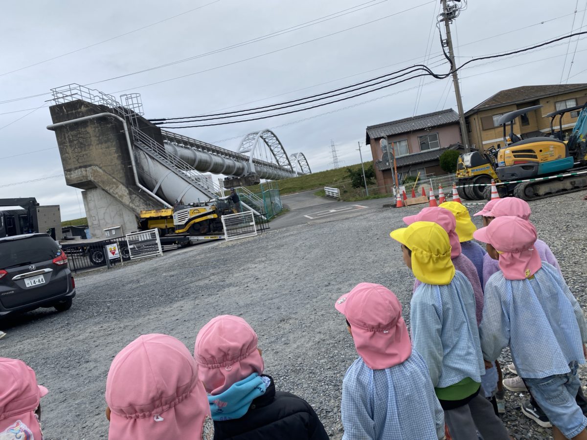 お散歩への出発時には、かっこいい工事の車がトラックに乗せられるところを見学することができました。「すごい!!」と拍手をしたり「ばいばーい」と手を振って、工事のお兄さんとの交流を楽しみました。