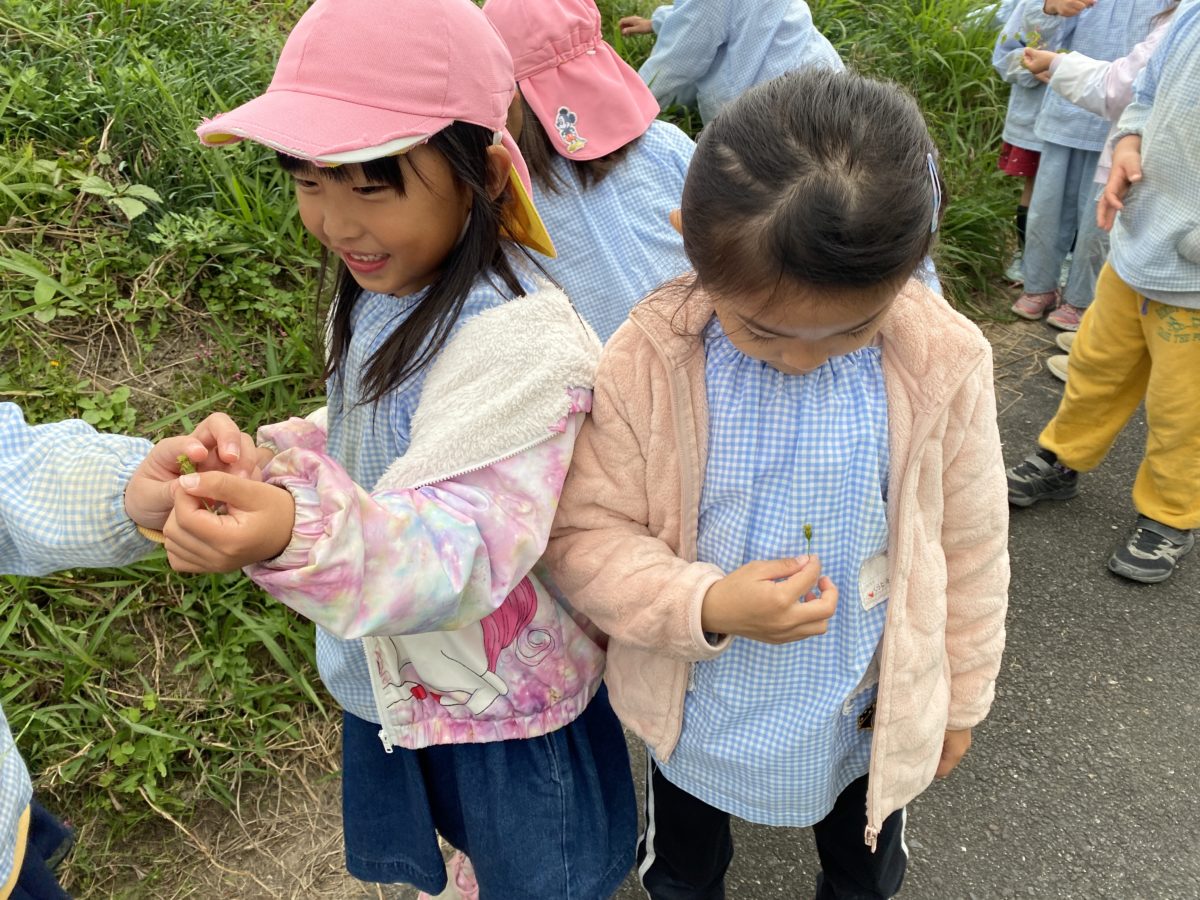 「くっついた!!」「みてみて!」お散歩中に見つけたくっつきむしを服につけて楽しむ姿がありました。