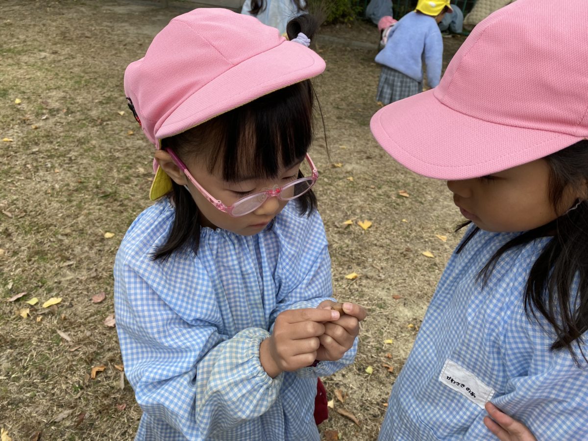 今日はいちご組さんのお友だちと一緒にお散歩へ出かけました。今日のお散歩の目的の一つは「むしがいそうなどんぐりさがし」です。きのう、むしおらんかったで・・・と話しながらどんぐり公園で「あな、あいとる!」「いろがきたない!」「われかけとる!」と友だちと拾ったどんぐりを見せ合いながら、虫がいそうなどんぐりばかりを集めていました。また木の葉の色が赤や黄色に変化していることにも気付き、拾って集める様子も見られました。また小学校では一年生のお友だちの持久走をこっそり見学させてもらいました。長い時間走り続けることに驚いたり、昨年のめろん組さんの姿を見つけて「がんばれー!!」と応援していました。帰り道には見えなくなるまで手を振ってくれるお姉さんもいて、めろん組さんも「ばいばーい!!」と元気いっぱいに手を振って小学校楽しみ!!という声も上がっていました。土手ではくっつきむしを見つけて「くっつく!!」と面白さを感じて、小さなお友だちの服にもつけてあげて楽しんでいました。園に戻ってからどんぐりの中の様子を見ようと「いしでもできる!」とアイデアを出し保育士が石で叩いてみるとすぐに砕けてびっくり!!「これ、あしでもいけるんじゃない!」と傷んでいるどんぐりが割れやすい事に気付いて足で踏んでみる姿がありました。まだ青いどんぐりは固くて割りづらいことに気付き、「これわれない!」「やってみて!」と友だちに知らせていました。今日もどんぐりから虫は見つからず、こんなにぼろぼろなのに・・・と不思議そうにしていました。
