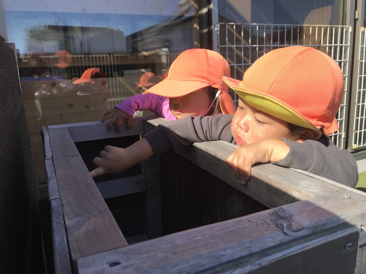 お友だちと一緒に園庭にお散歩へ。園庭に置いてある箱の中を覗き、木の模様を指でなぞりながら「これなに~?」と木の年輪を不思議そうに眺め、お友だちもその声を聞き「なになに?」と近寄ってきてみんなで覗いていました。中に何か入っているかもと中を見ようとしている姿もありました。覗き終わると、横にある窓に自分がいるのを発見、「ぼくがいる~」と窓に興味津々で近寄っていくと、他のお友だちも映っているのを見付け「映ってるよ~!」と手招きをして呼んで窓に映る自分を見て不思議そうな顔をしていました。その後は「よーいどん!」と声を出してみんなでかけっこを楽しんでいました。初めは保育士の「よーいどん」の声に合わせて、走り出していましたが、何度も走っているうちに自分たちで「よーいどん!」と言ってから走り出していました。ゴールをすると、お友だちと「タッチ!」と言ってハイタッチをしていると楽しくなってきたのか何度もハイタッチを繰り返し、「タッチ!タッチ!」と言っていました。