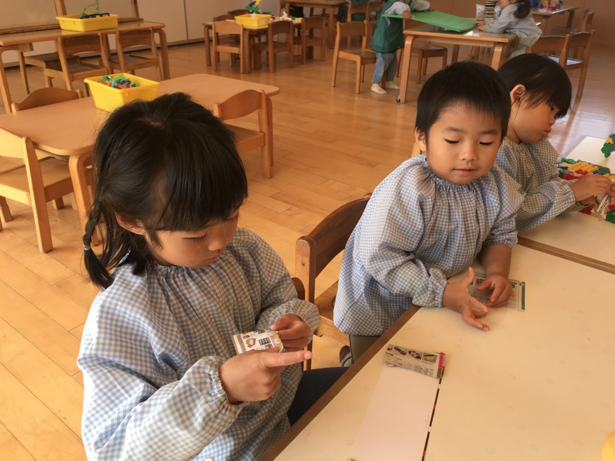 先日折り紙でポインセチアを折ったので今日はサンタブーツを折りました。細長い紙にブーツをいくつか貼って楽しんでいました。