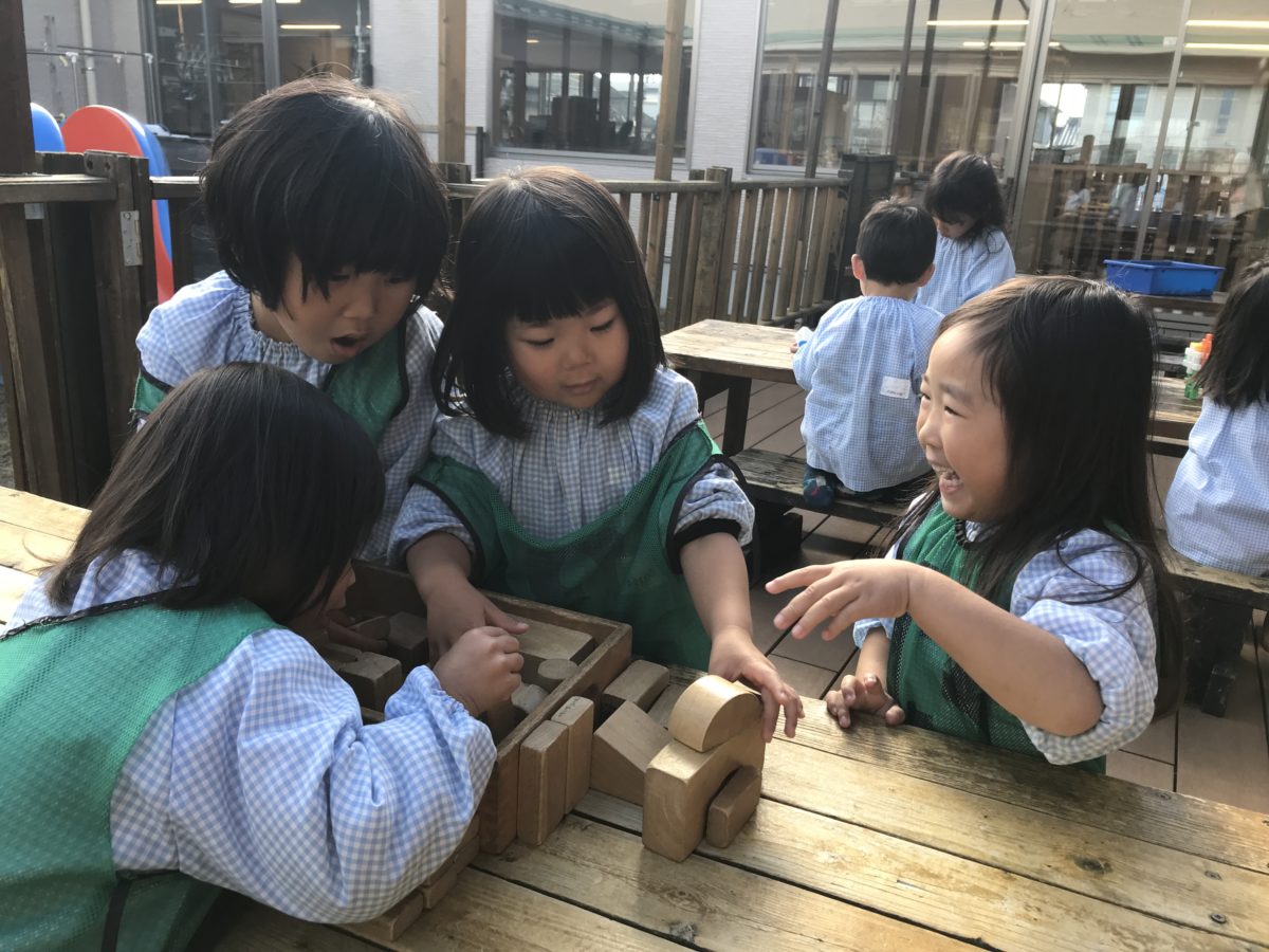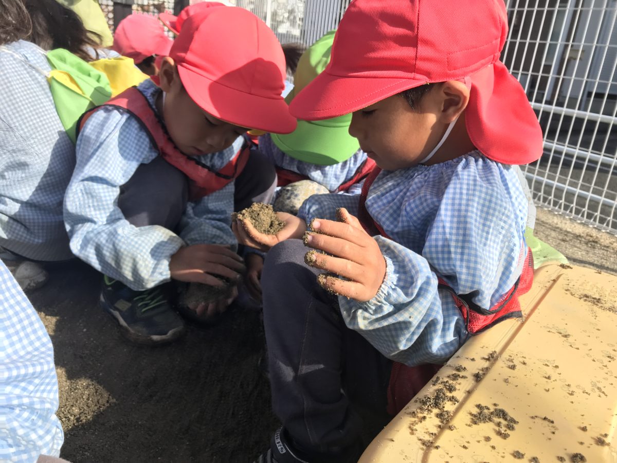 今日は園庭の土が絶好調のお団子作り日和。お団子ブームの子どもたちは今日もお団子作りに夢中です。「今日は泥やからお団子作りやす!」「見て!ハンバーグみたいなの出来た!」「お団子何個も作れるで!」と張り切る姿も。ただ途中で一つ気付いたようで、「今日は白いサラサラの砂がない!」「お団子どうやって磨くん?」と話す子どもたち。「今日はお団子の形だけいっぱい作ろう!」と何個も何個もお団子を作る子がいたり、形を変えて作ってみたりとお団子大量生産の日でした。また、乾いたサラサラの砂がなくても少し湿った砂を掛けて代用する子がいて、その子たちはひたすら少し湿っている砂をかけ、そこからピカピカの泥団子を作ろうとひたすら集中して砂を無心で掛け続け、つるつるに磨こうと手のひらでこすっていました。今日の土の状況などから自分たちで作るお団子のスタイルを変えていく子どもたち。色々考えているんだなっと改めて感心しました。