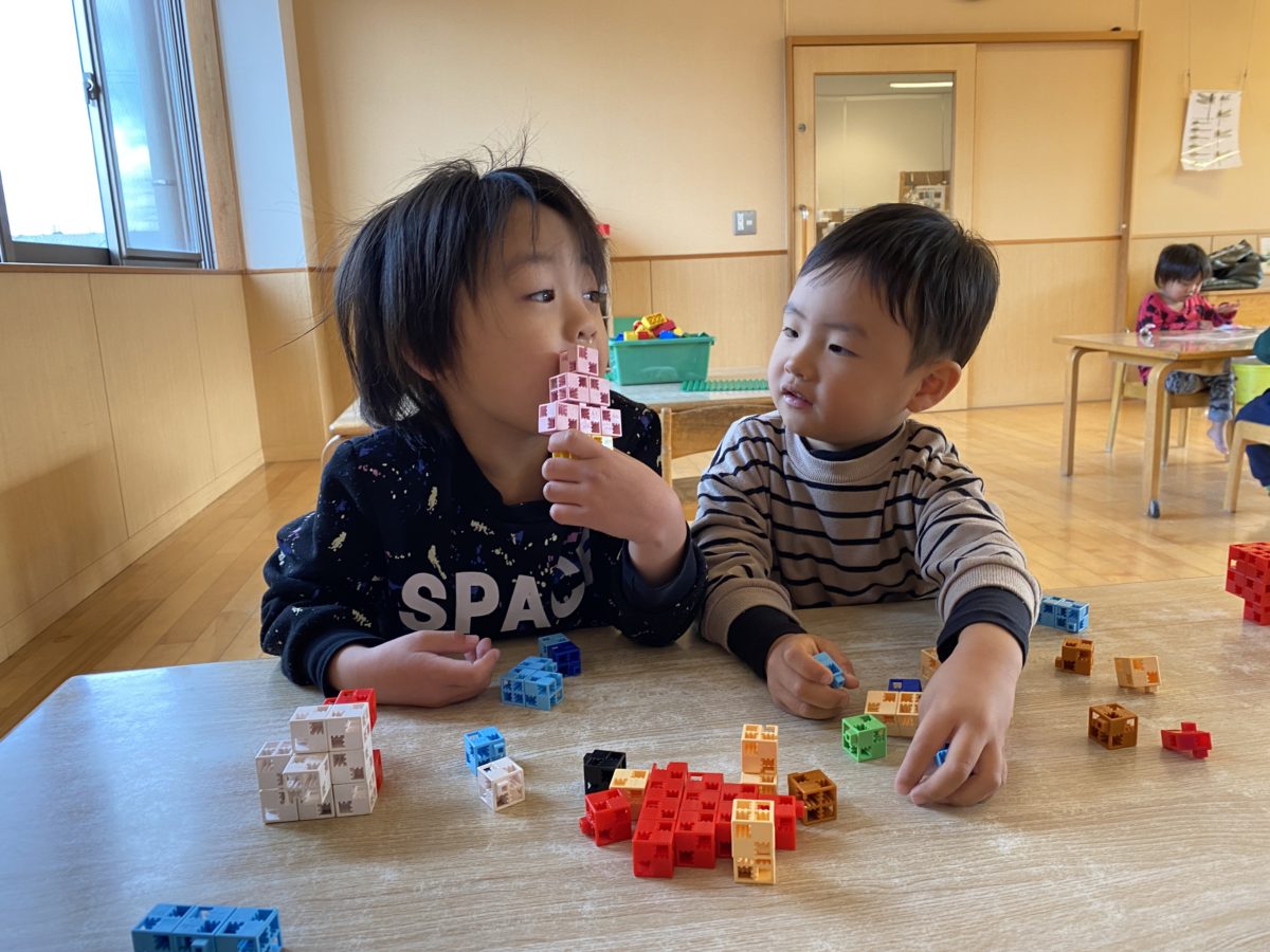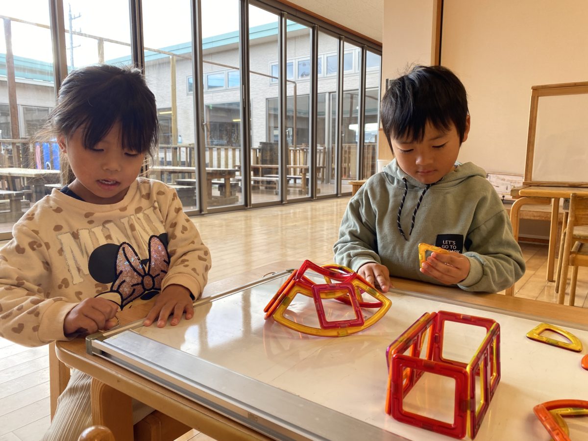 「みてー!スーパーできた!」「こっちはくるまだよ!」とブロック遊びに夢中な子どもたち。保育園にある様々なブロックを使い、子どもたちは色々な物に変身させます。中でも人気なのがマグネットのおもちゃ。四角や丸・三角など様々な形を組み合わせながら何やら作っています。マグネットボードに張り付けたり、立体的に組んでみたり。黙々と作っている中「みて!できた!これテレビ!」とどうやらテレビを作っていたようです。出来上がったテレビの前に椅子を置き、まるで本物のテレビのようです!そんな姿を見ていた周りのお友だちも「○○ちゃんもつくる!」と机の上には沢山の素敵な作品が並んでいました。別の場所でも、おもちゃを使い何かを作る姿があります。四角い形のブロックを組み合わせ「アイスクリームつくってるの」とここではどうやらアイスクリーム屋さんが開店している様子。ピンク色のブロックを繋ぎ合わせ「これはいちごのアイスクリーム」「こっちはチョコだよ」と色々な味のアイスクリームが次々に完成していきます。「いただきまーす!」「ぺろぺろ」と食べる真似をしてみたり、「いらっしゃいませ~」とレジスターをカタカタと打ちながらアイスクリーム屋さん。そんな声を聞いていた周りのお友だちは「○○くんはハンバーガーつくる!」とまた別のブロックを手に取りハンバーガー作りに挑戦。完成した物を並べ、ハンバーガー屋さんも無事開店です!お部屋のあちらこちらに色々なお店が立ち並び楽しそうな子どもたちでした。
