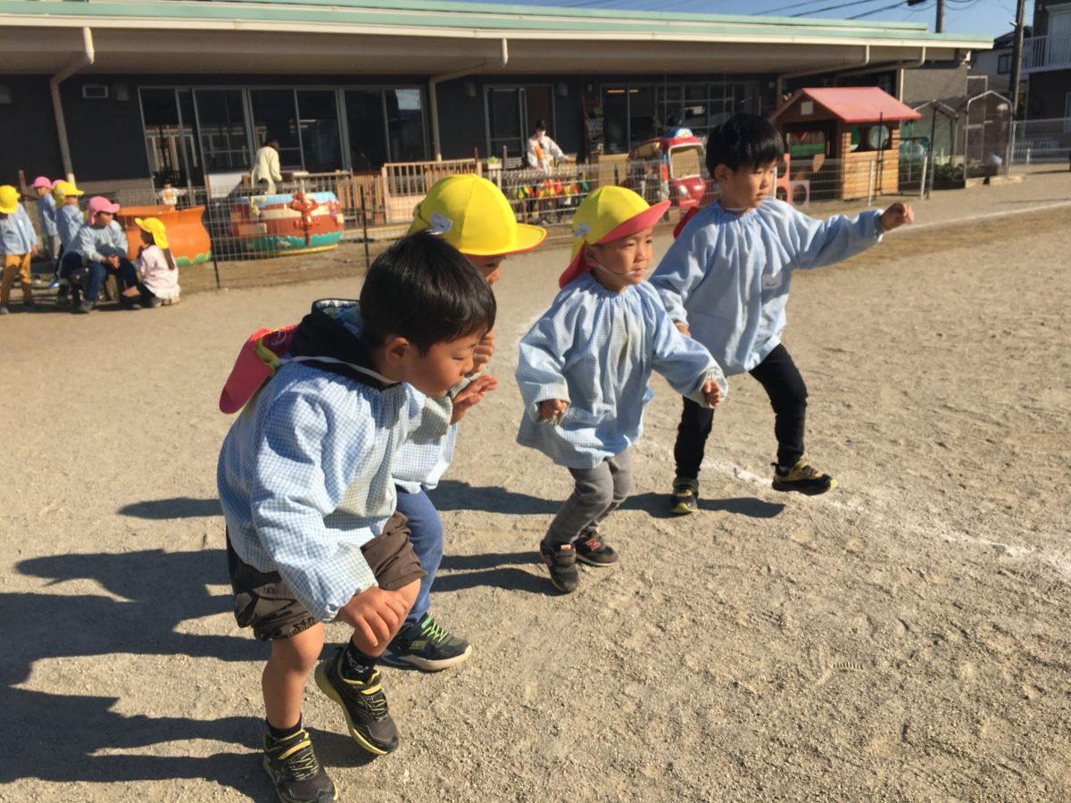 かけっこやろうよ!とみんなで競争が始まりそうです。今日の1位はだれかな?