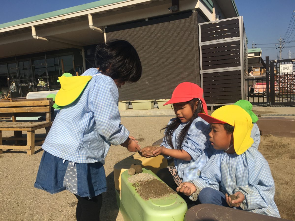 「いらっしゃいませ~」と砂場では泥団子づくりから、今度は団子屋さんごっこが始まりました。