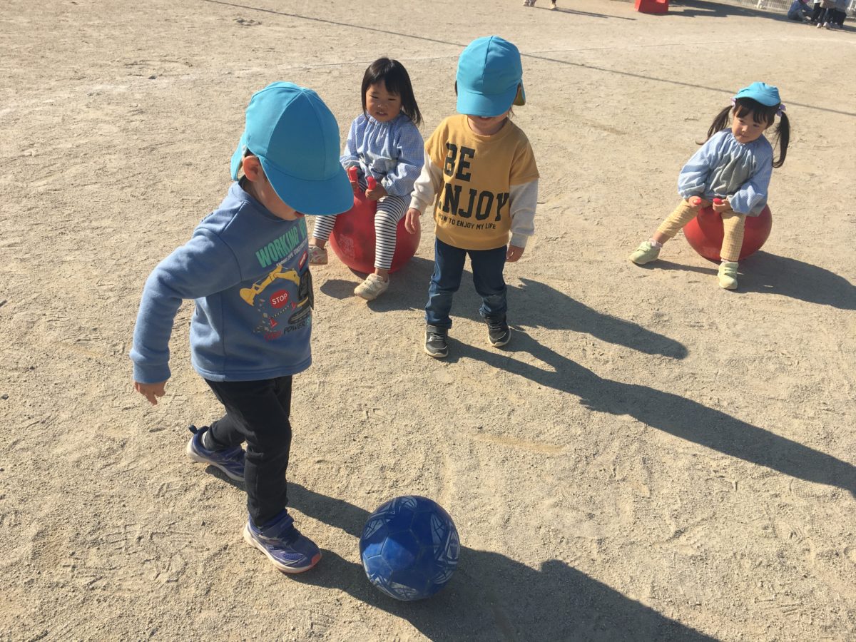 「えーい!」と力強くボールを蹴ってサッカーのように楽しむりんご組さん。