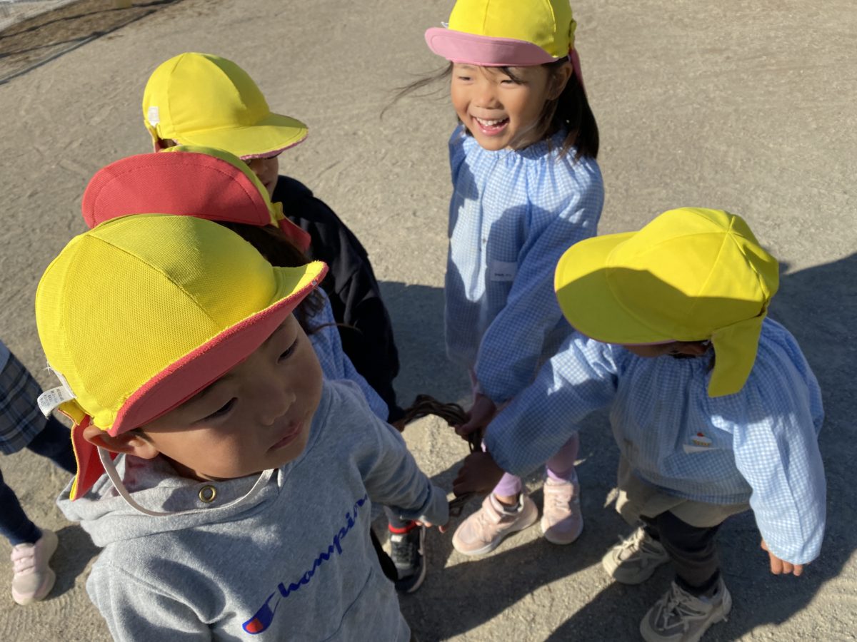 朝は以前読んだじゅうにしのおはなしを昨日のつるのリースを頭に乗せて神様のリースに例えて、劇遊びを楽しみました。「ねこ、したいひとー!!」とお友だちを誘ってお話しをすすめていました。りんご組さんたちに「みたい?」とお客さん役に誘う姿もありました。その後「〇〇くん、きじしたいって!」とももたろうの話もすすめていました。その後園庭では桃太郎のお話しに例えた鬼ごっこを楽しみました。いつもは追いかける鬼さんが逃げる役、ももたろうが追いかけ役、タッチしてもじゃんけんで桃太郎さんが勝たないとまた逃げることができるというルールで楽しみ、途中、イヌ役、サル役、キジ役と追いかけ役を追加させながら最後まで残ることができるよう、走るのもじゃんけんするのも全力!!で頑張っていました。いつもとは違い逃げるのがおにさん!というのも面白さを感じていました。またテレビで見た大人のリレーを真似ながら、少人数のリレーチームで最下位のチームが毎回敗退していくというルールで、一人一周で何回も予選をして何回も走って決勝まで残ろうと競いました。何回戦していても毎回のダッシュ!!は素晴らしく、いつも以上に速く気持ちよさそうに走っていました。