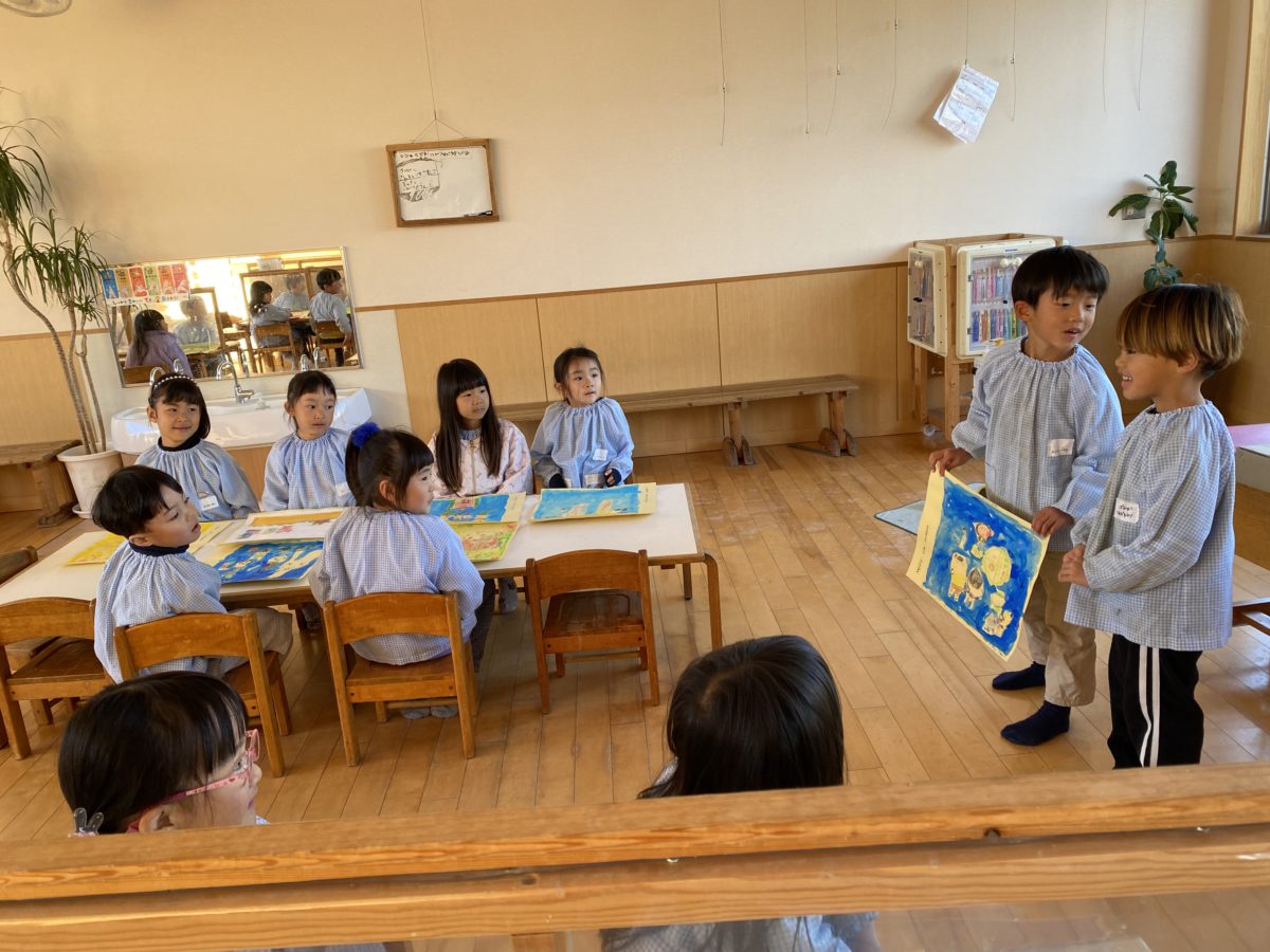 「〇〇くんの〇〇のえが・・・!!」「じょうずだった!」「すごかった!」素敵だなと思ったお友だちの絵をみんなに紹介しながら、印象に残ったところを発表しました。
