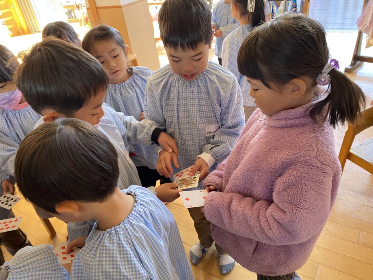 今日は自分の引いたカードの数が引き算で答えが「0」になるお友だちを探しました。「12から10と2をひいたら、ゼロ!!じゃない?」みんなで考え中です。
