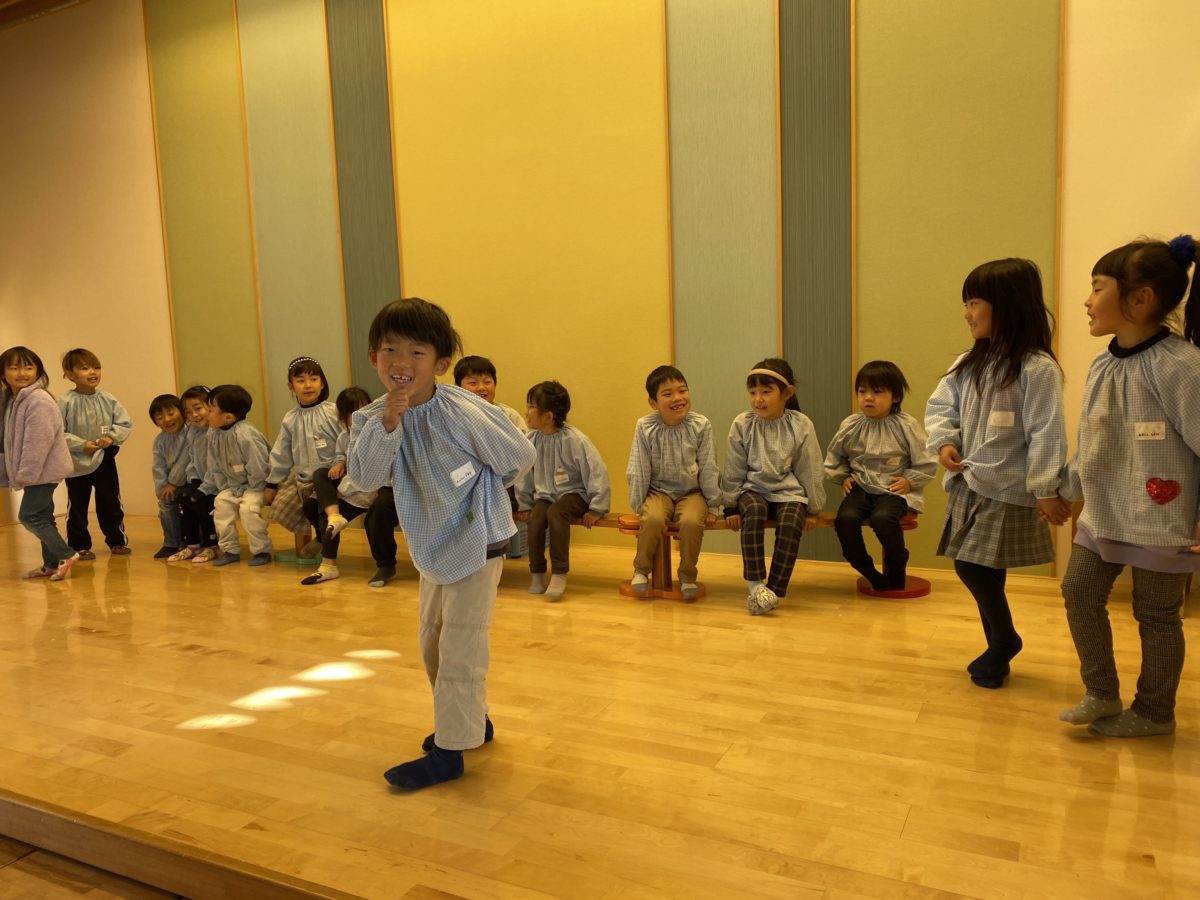 劇遊びでは「おじいさん」をイメージして体を動かす姿がありました。お友だちのセリフでお話しがすすんでいくのを笑顔で楽しんでいました。