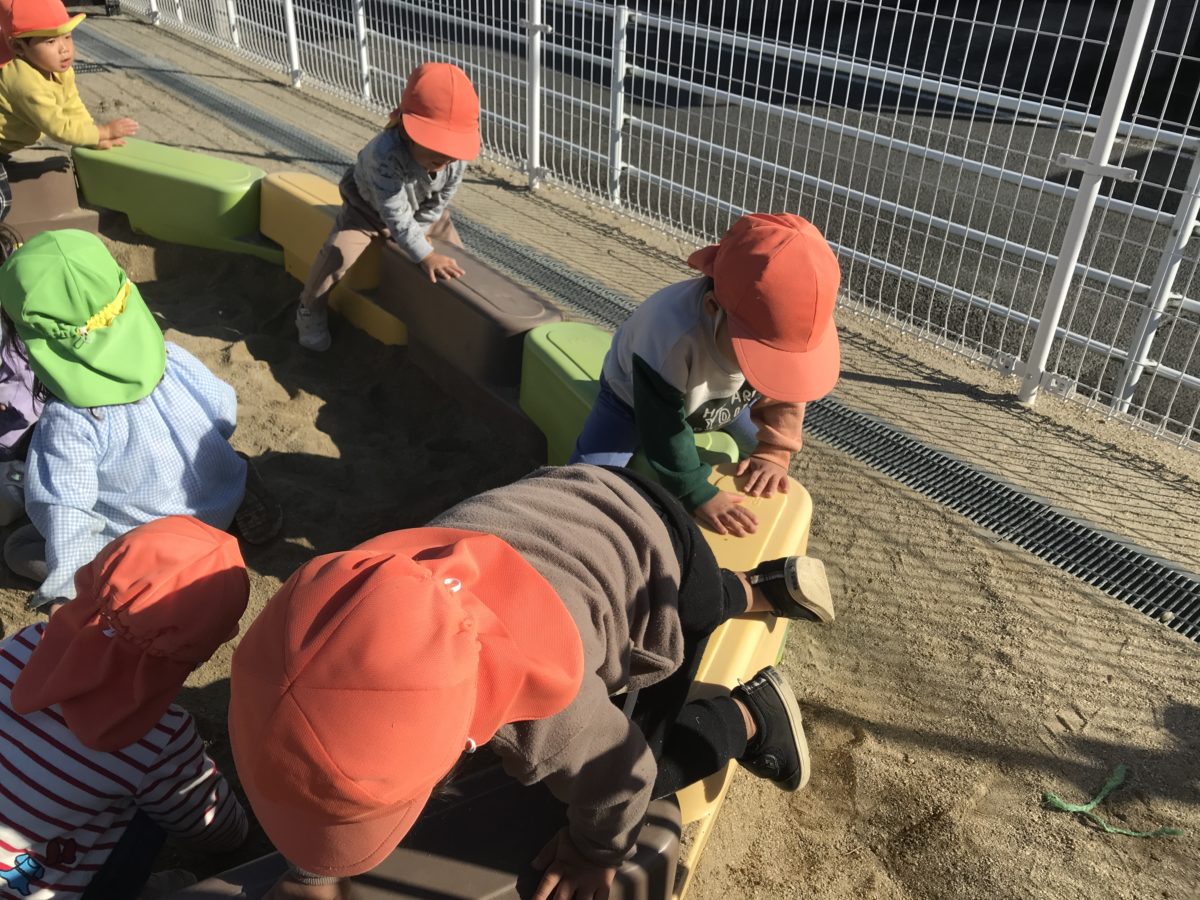 電車ごっこをするのも好きで線路も描いてみたところ、その上をがたんごとんと言いながら走る姿や砂場の枠を線路に見立てて電車になりきって楽しむ姿がありました。自分たちで遊びを広げていくことが増えてきたように感じます。