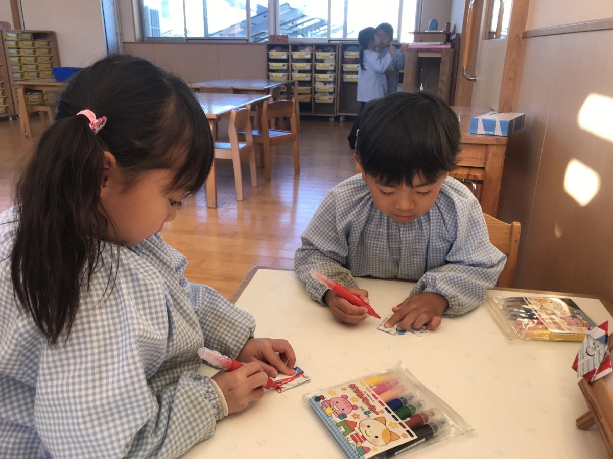 折り紙で作ったサンタさんに色を塗っていました。
