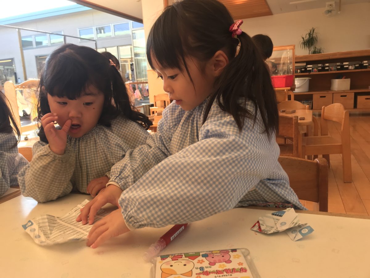 今日は朝登園時にクリスマスのプレゼントの袋を持って登園していたので、みんなの袋の飾りが気になる子どもたち。「サンタさんがおるー!」「プレゼントかなこれ?」「ツリー綺麗!」「りぼんかわいい!」とみんなそれぞれに感想を話す姿があったので、お部屋に他にもクリスマスの折り紙の折り方の紙を用意してあったのですが、「このサンタさんかわいい!」と言いていたサンタさんの折り方を用意しました。「サンタさん折りたい!と話したお友だちを中心に、折り進め、「わからんもん。」と話したさくらんぼ組のお友だちにも丁寧に折り方を教えてあげる姿がありました。サンタさんが折れると、「色塗りたい!」と話し、マーカーやクレヨンを取りに行き、赤い帽子にピンクの袖にぶったりして、自分のオリジナルサンタさん作りを楽しんでいました。作ったサンタさんは大事そうにポケットにしまっていて、とても可愛らしかったです。
