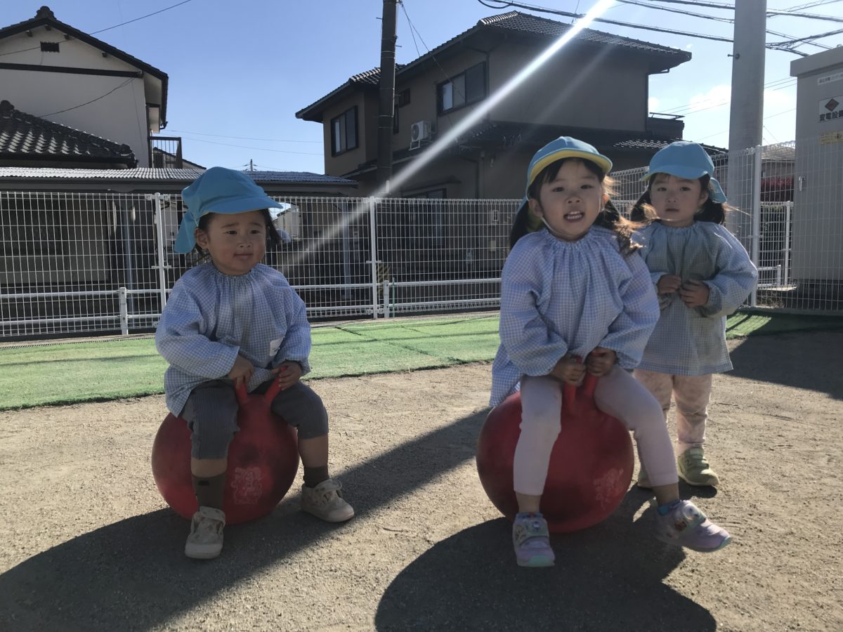 バランスボールに乗って、「よーいどん!」と競争を楽しんでました。