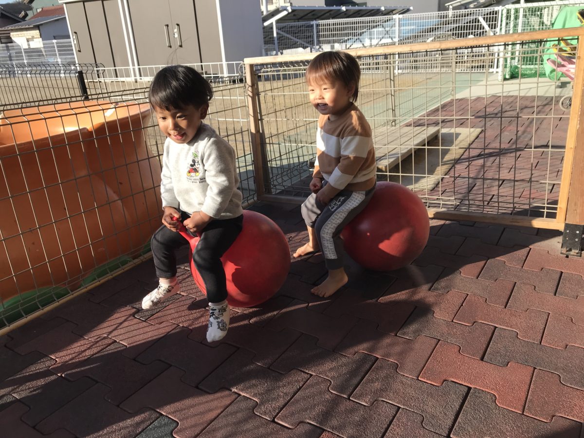 テラスにではバランスボールに乗ってお友だちと一緒に「ピョンピョン」と言いながらテラスをぐるっと一周していました。上手にバランスを取りながら繰り返し楽しんでいます。園庭に出ると、車の遊具に乗って、「バイバーイ!」と「ドライブにしゅっぱーつ!」お友だちに「いい?」と声をかけて友達とのやり取りを楽しみながら、運転席を交代して遊んでいます。自分の順番が来るまで隣に座って一緒にドライブをしていました。