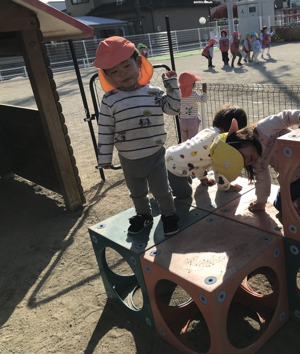 カラーボックスで遊んでいたお友だちは、園庭でお兄さんお姉さんがダンスをしているのを見つけると、カラーボックスに登ってダンスダンス!と音楽に合わせてお友だちが躍っていると自分も!というようにみんなでダンスを楽しんでいました。