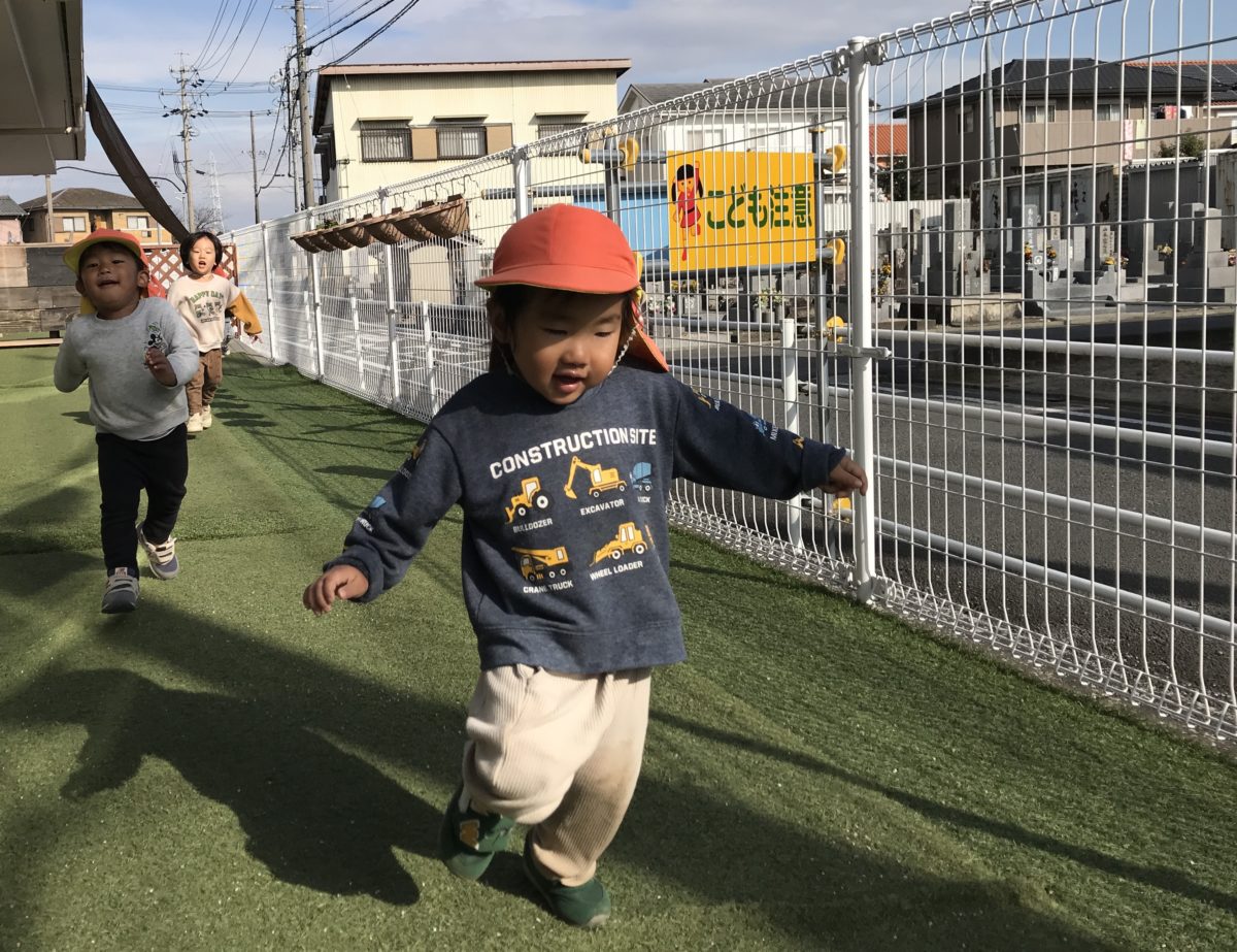 ベビーカーに乗って少し広い園庭に行ったお友だちは保育者の「よーいどん!」の声でみんなで一直線に走り、ゴールすると次は、自分たちで「よーいどん!」と言いながら繰り返し走っていました。