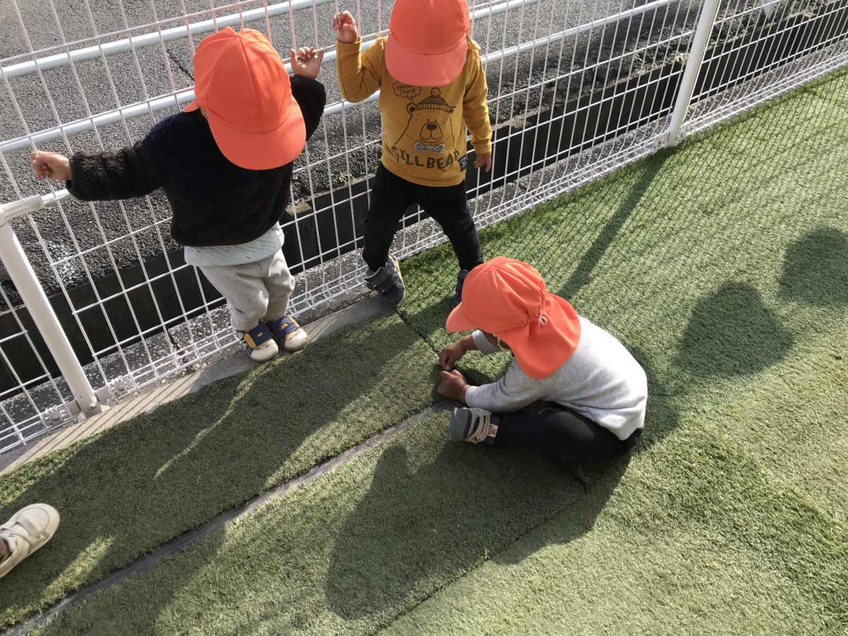 園庭に敷いてある人工芝が気になったのか、「なあに?」と言ってトントンと手で叩いてみたり、なでて感触を楽しんでいました。