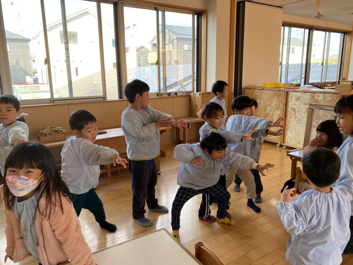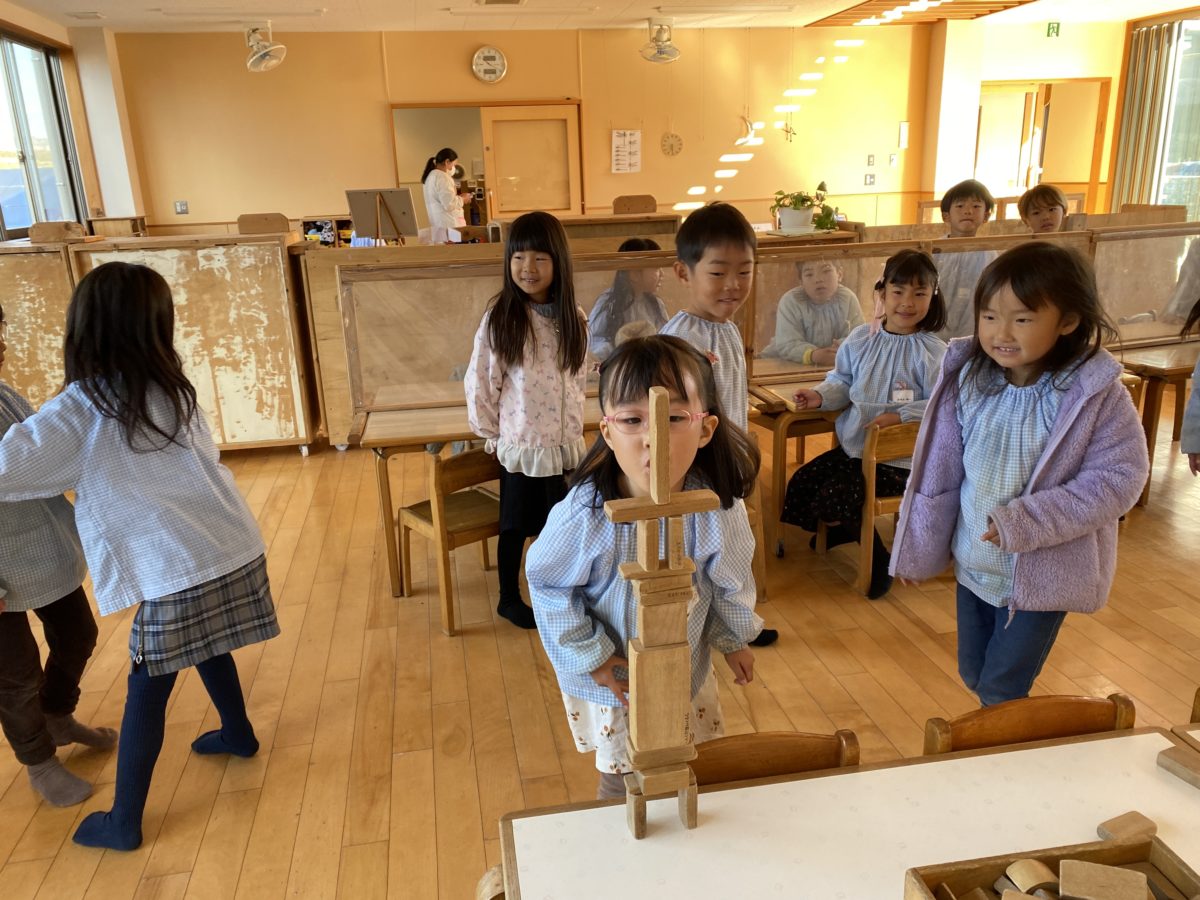 二つのチームに分かれて積み木を高く積めるか競った後、触ったりせずに倒すことができるかな?「ふーっ」と息を吹いて倒れるか試していました。
