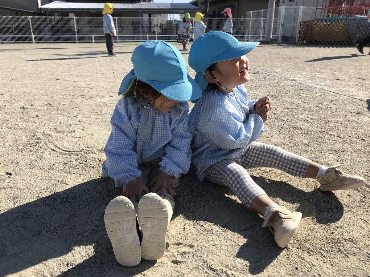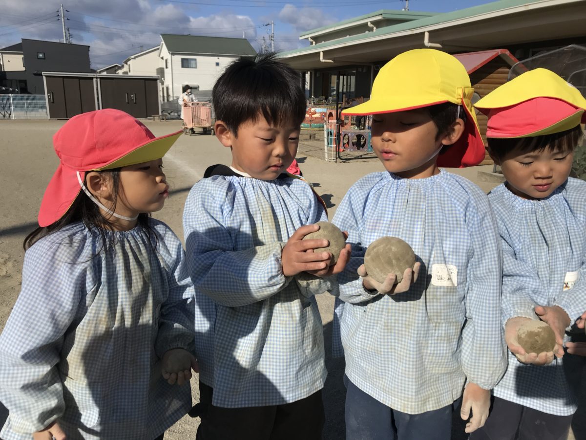 今日もお団子作りに夢中な子どもたち。「見て!どっちが大きいと思う?」「え?こっちかな?」「それともこっち?」と大きさを」見比べ、「こっちのが大きくて固い!」と「こっからサラ砂をいっぱいかけて・・・。」とサラサラの砂をいっぱいかけた後はひたすら手のひらでお団子をこする子どもたち。「お団子ピカピカにならんかな?」「お部屋にあった写真のお団子ピカピカやったで!」「あんなピカピカなん欲しいの!」と自分たちの思いを話しながら、ひたすらお団子を磨く子どもたち。途中でボロっと崩れてしまうと残念そうにしてますが、「もう一回つくる!」とやる気を新たに再びお団子作りをし、その物凄い集中力にとても感心させられます。お団子づくりの形は人によって様々で、大きいものを作っていれば小さいものを作っている子。その小さいお団子の中でもビー玉位の大きさのお団子を作っている子が居て、作る過程の力加減や繊細さを考えると、その大きさのお団子を作っていることに驚き、感動しました。子どもたちの発想や挑戦する姿は大人の想像をはるかに超えて、その姿に日々感心させられています・。