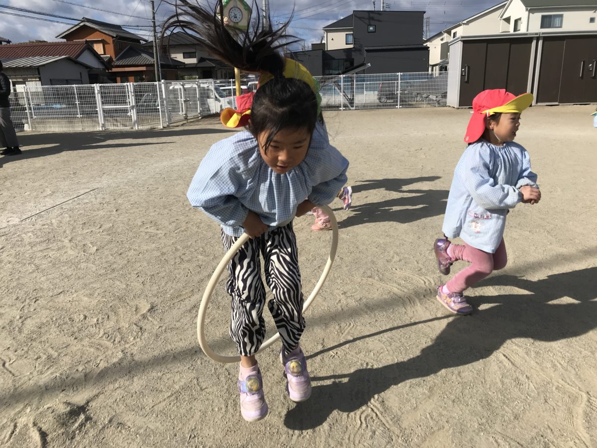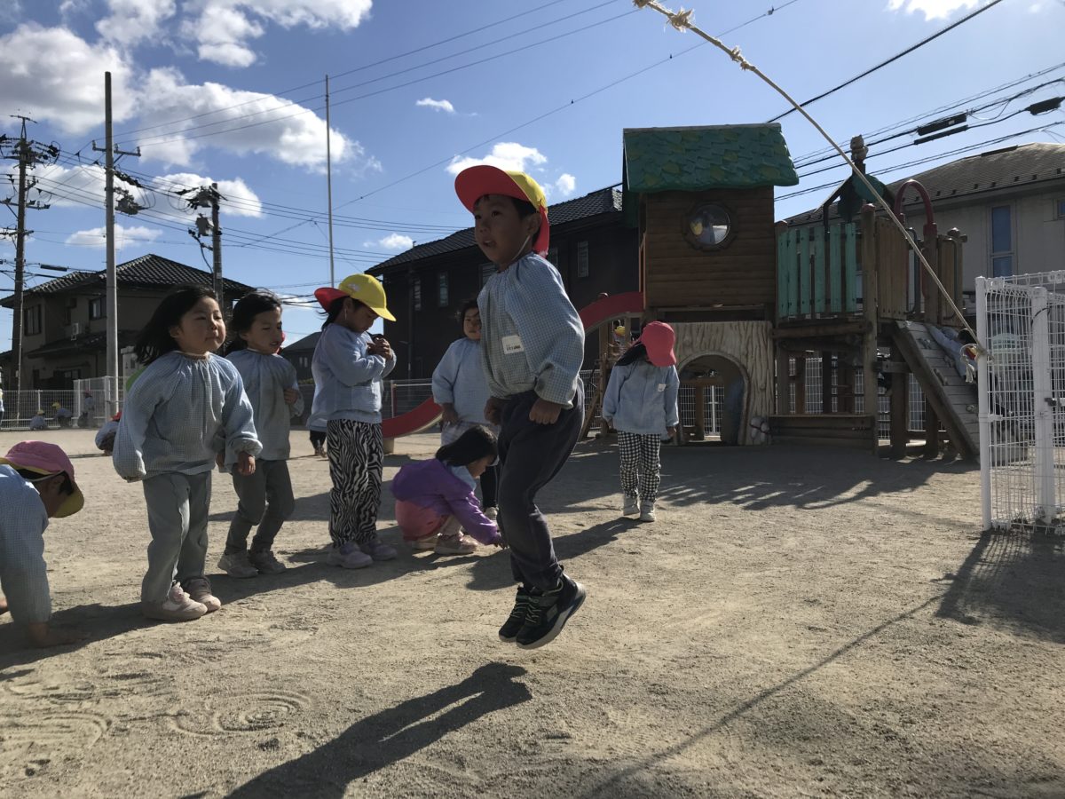 前から挑戦していた大繩。さくらんぼ組さんでたくさん飛んだお友だちの写真と記録を飾っていると、その跳んだ回数に驚き、他の子のやる気にもつながったようで、めろん組さんと共並び、縄跳に挑戦する姿がありました。そしてばなな組のお友だちも記録更新。85回跳んでいました。周りのお友だちも一緒に数を数えながら応援!50回を過ぎると数えている声も興奮しているのが分かり、大盛り上がりでした。「85回ってすごいな~!」「いっぱい跳んでみたい!」と周りでもそんな声が聴こえ、自分の次へのやる気にも繋がっているようでした。