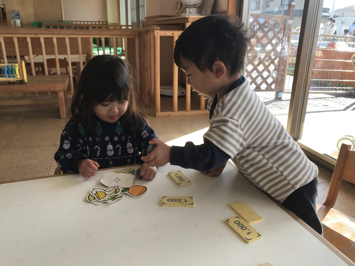 園庭の小さな小屋の窓から『コンコンコン!』とノックする音が。覗いてみると「こんにちわ~!」とお友達に元気に挨拶をして、お買い物ごっこが始まりました。「はい、これ!」と砂をお店の品物に見立てて渡したり、窓に並べたりして楽しんでいました。お部屋でも絵カードを一つ一つ選んでお友達と交換したり、「はい、おかね!」とお金も使ってお買い物ごっこをする姿がありました。