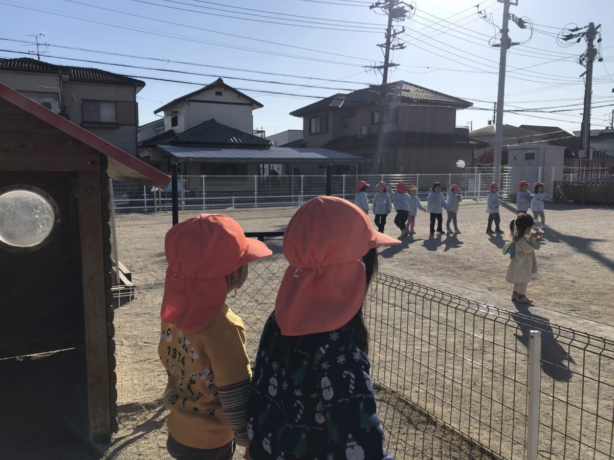また、テラスでは『こんにちわ おひさま』の絵本を見ながら、「こんにちわ!」「ぞうさん!こんにちわ!」と口々に言ったり、「さるや!ウッキー!」と出てきた動物の真似をして盛り上がっていました。ごっこ遊びをする姿が多くなってきて、会話の中でも知っている日常の挨拶を使いながら楽しむ姿がたくさん見られました。
