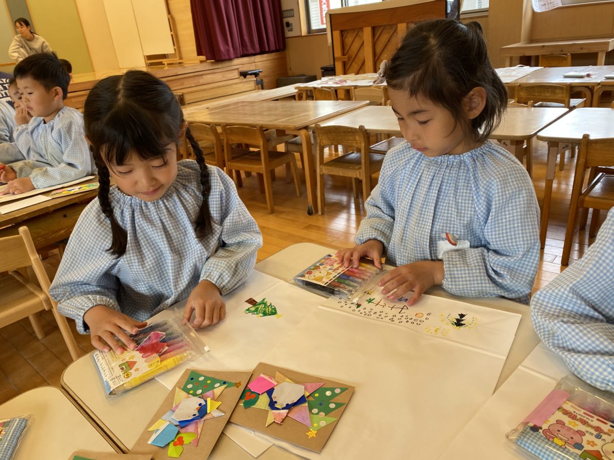 今日はダンス教室と習字教室に参加しました。ダンス教室では音楽に合わせて体を柔軟に曲げたり、バランスをとるのに難しいポーズにも挑戦し頑張っていました。習字教室では先週より書き始めた自分の好きな文字に、再びに挑戦しました。「み・か・んってかいたんだった!」「〇〇ちゃんといっしょで花!」と友だちと自分が書いた文字について話しながら、筆を動かしていました。自分の書いた文字を見てお手本と見比べたり、もういっかい!とていねいに何度も書いていました。一人ひとりがじっくり集中する姿が見られました。また来週お世話になる河原田地区のすくすくサロンの方から18日のクリスマスマーケットの招待状が届きました。素敵なクリスマスの飾りつけのしてある封筒に大喜びしながら、招待状の内容を見て「マーケットって買い物?」「クリスマスマーケットってたのしみ!」「じかんもかいてある!」「まえのめろんさんがめちゃかいものしてたやつじゃない?」と情報を得ていました。招待状やお買い物袋に自分の名前をていねいに記していました。