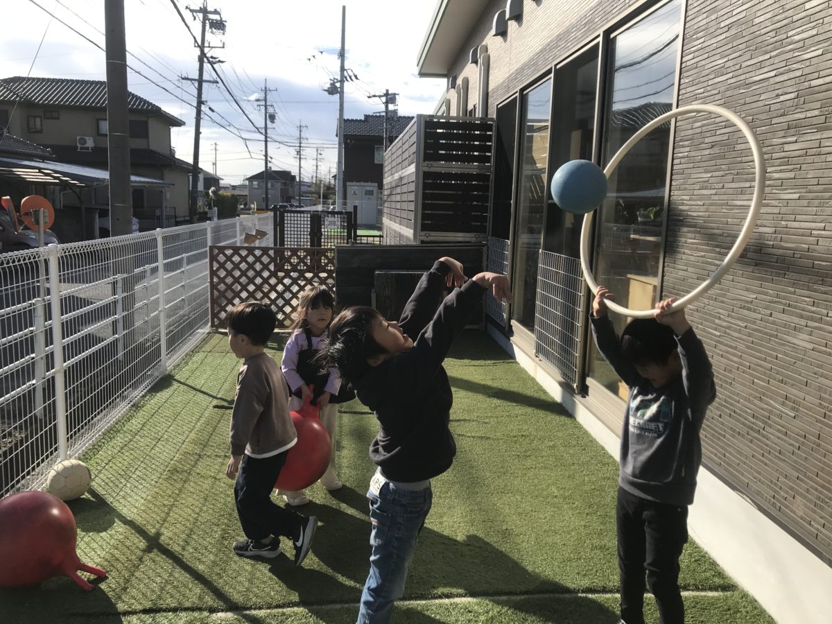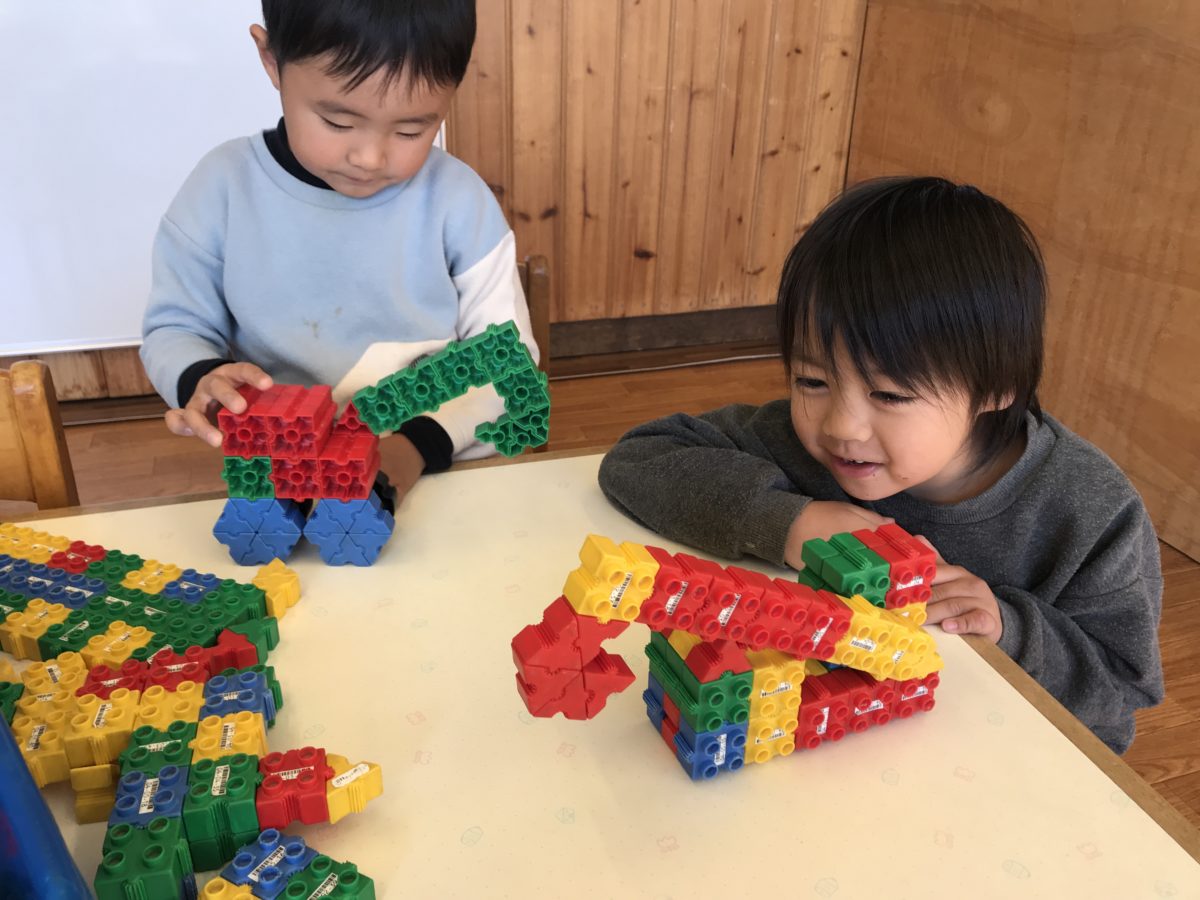 「そとで鬼ごっこしよ!」めろん組のお友だちが呼びかけるとあっという間にみんなが集まり、鬼ごっこが始まりました。めろん組のお友達はさすが!足が速いですが、他のお友だちも負けまいとすごい勢いで逃げていました。「ボールであそびたい」と、ボールを出すと、ボールをできるだけ高く投げようと何度も何度も挑戦していました。その後ボールをフープの中に通す遊びにかわっていき、子どもたちでいろいろ考えながら遊びを展開させていく様子が見られました。室内では、ブロックでショベルカーを作っていると、クレーン車を作るお友だちもいて、「タイヤがないからタイヤつくろ」「みてみて、こんなのはこべるよ」と玩具の電車を乗せて走らせたり、2台で走らせて遊んでいました。遊んでいるうちに、いろいろな部品を足したり大きくしたり、どんどん形を変え、パワーアップさせていました。